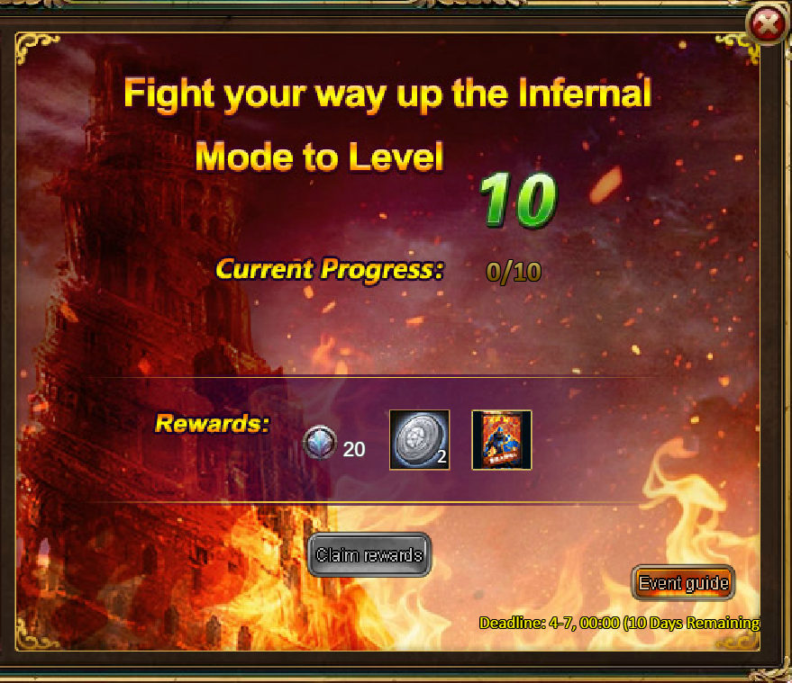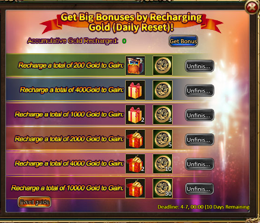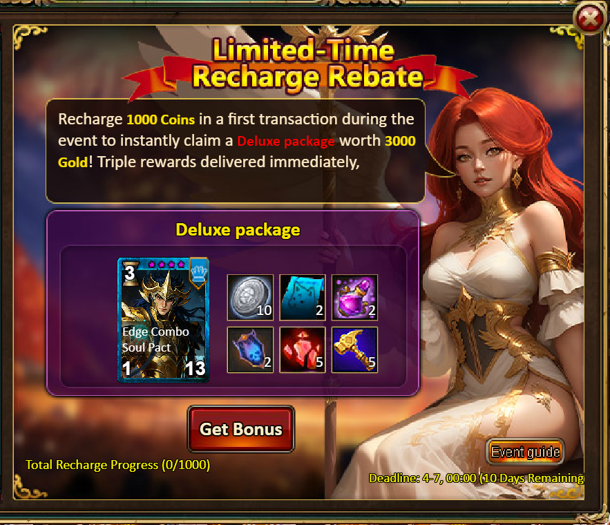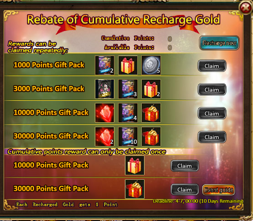3.Recharge Rebate: Steel-edge Reaper (Epic)*1 / Silver*100,000 / Mystical Valley Ticket*2 / Dark Champion Potion*2 / Tome Hall Ticket*2 / Ruby Fragment*5 / Golden Hammer*5