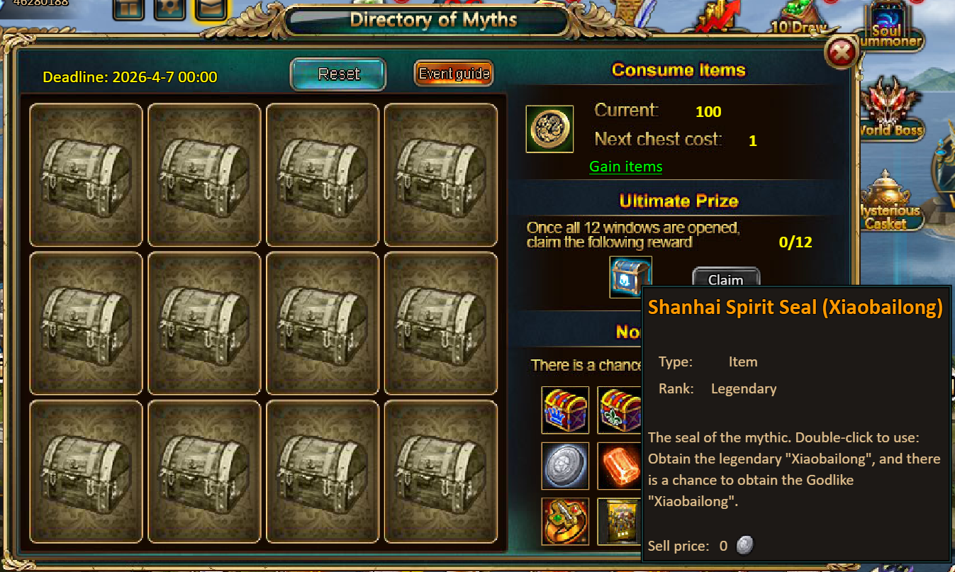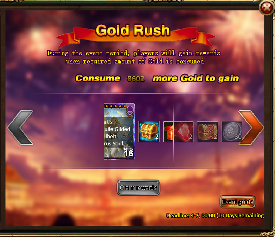 Consume 90,000 gold coins: Black Opal*1, Godlike Box II*6, Solar Chest (Legendary)*6, Silver*5,000,000[/u]