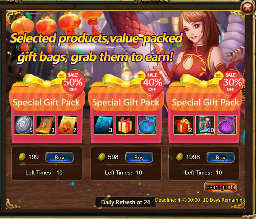 5 packs of Egyptian God Pack - Elixir of Energy (10 Points)*3 / Tome Hall Ticket*2 / Silver*300,000