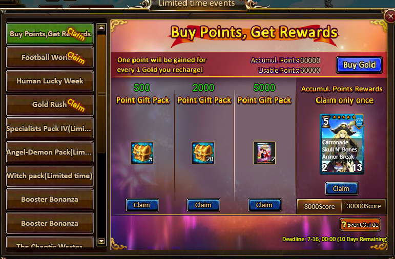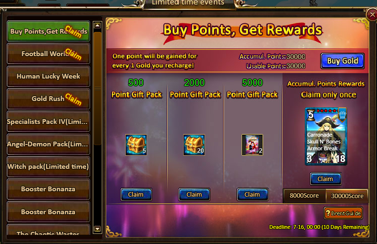 1.Buy Points, Get Rewards: 8000 - Priss Swift (Legendary) / 30000 - Priss Swift (Godlike)