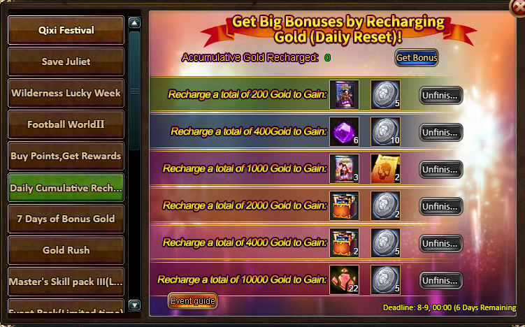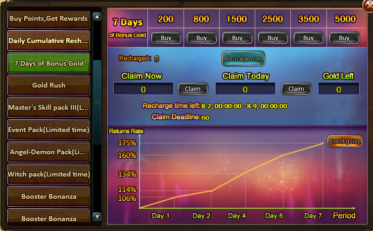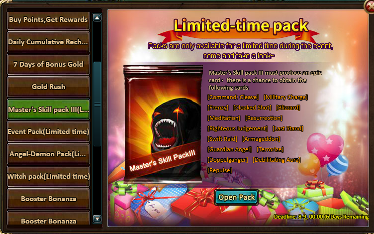 Consume 2,000 gold coins: Mega Cards Box (Epic)*1, Dark Champion Potion (Godlike)*2, Silver*200,000