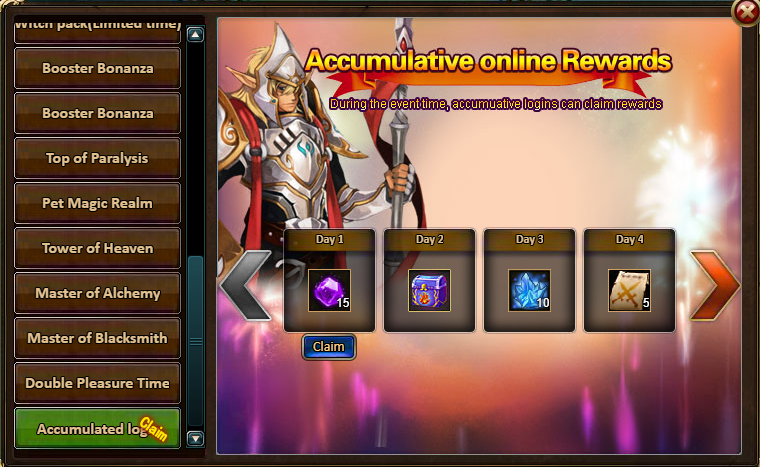 Consume 5,000 gold coins: Healing Saddle (7 days)*1, Fire Opal*2, Pet Magic Realm Ticket*5