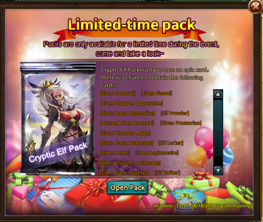 10 packs of Cryptic Elf Pack - Windrunner's Blessing (Epic, 7days)*1 / Lunar Chest(Epic)*1