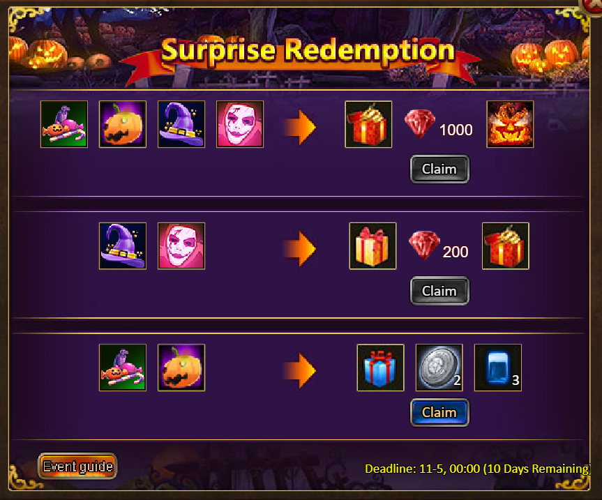 Exchange Method: In the game, players can obtain "[b]Candy[/b]," "[b]Pumpkin Lantern[/b]," "[b]Witch's Hat[/b]," and "[b]Wacky Mask[/b]" by completing various tasks, participating in event dungeons, defeating monsters, etc. Players can save the characters they have obtained in the character collection backpack. When a certain number of characters are collected, they can exchange for corresponding rewards.