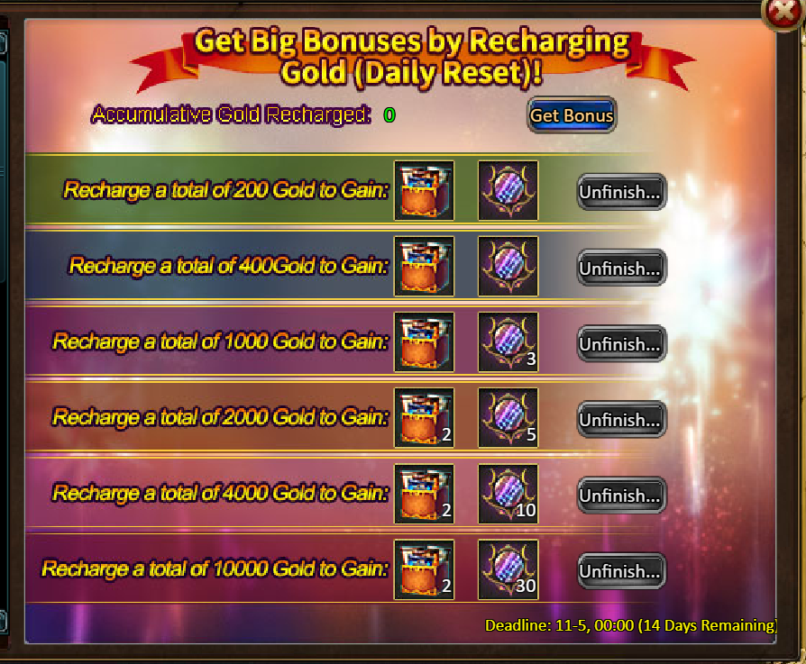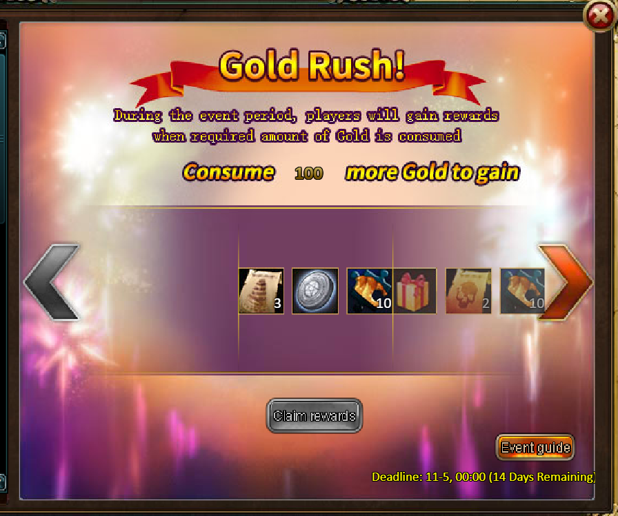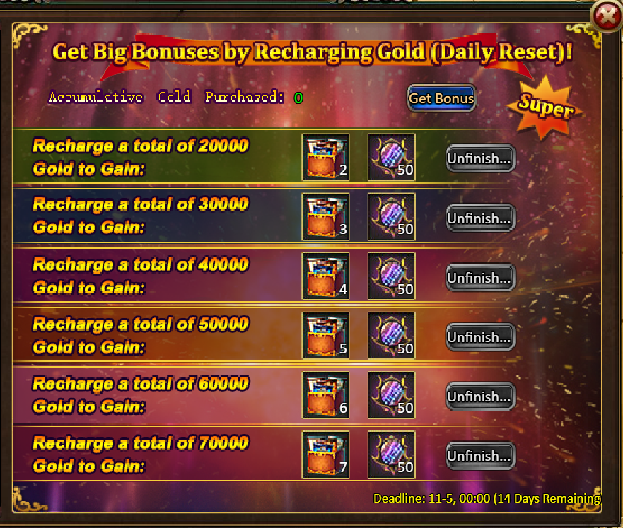 Consume 50,000 gold coins: Black Opal*1, Solar Chest (Legendary)*2, Pet Pleasure*5[/u]