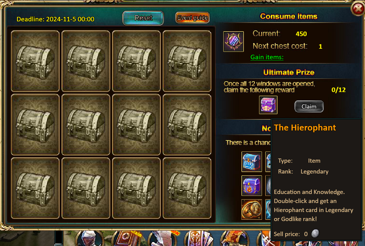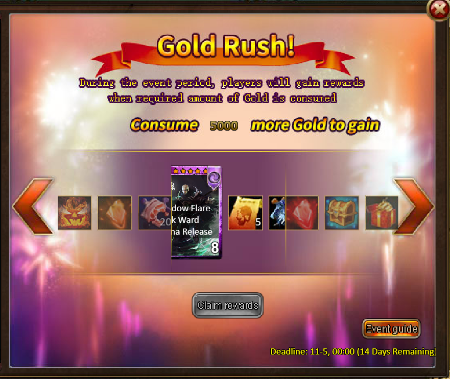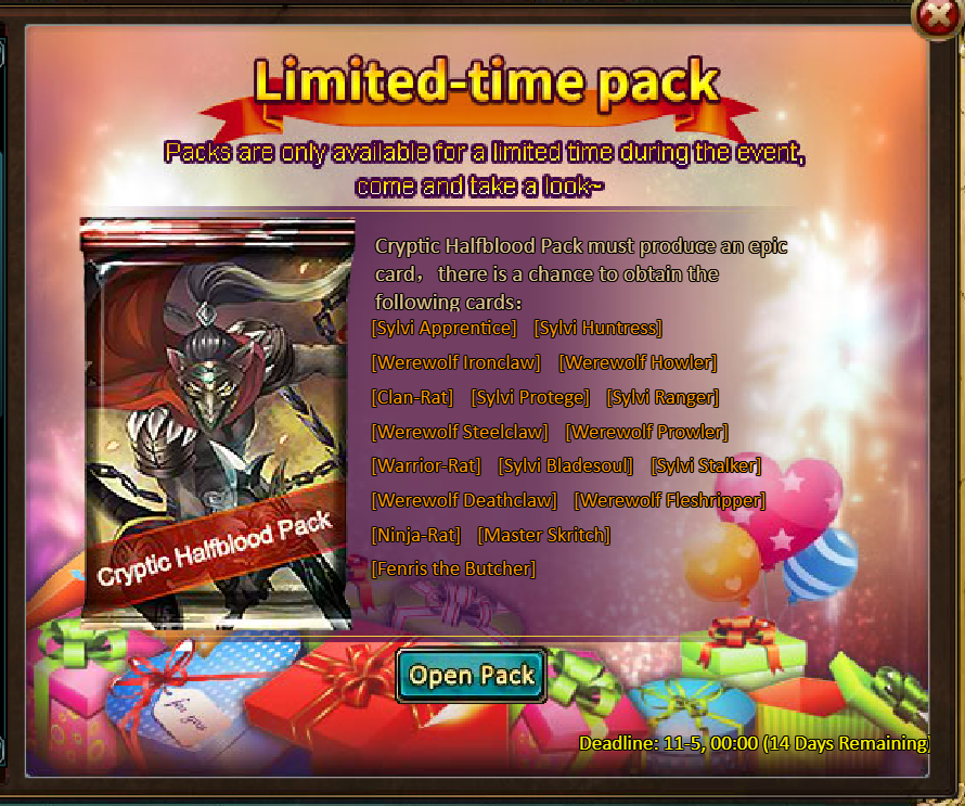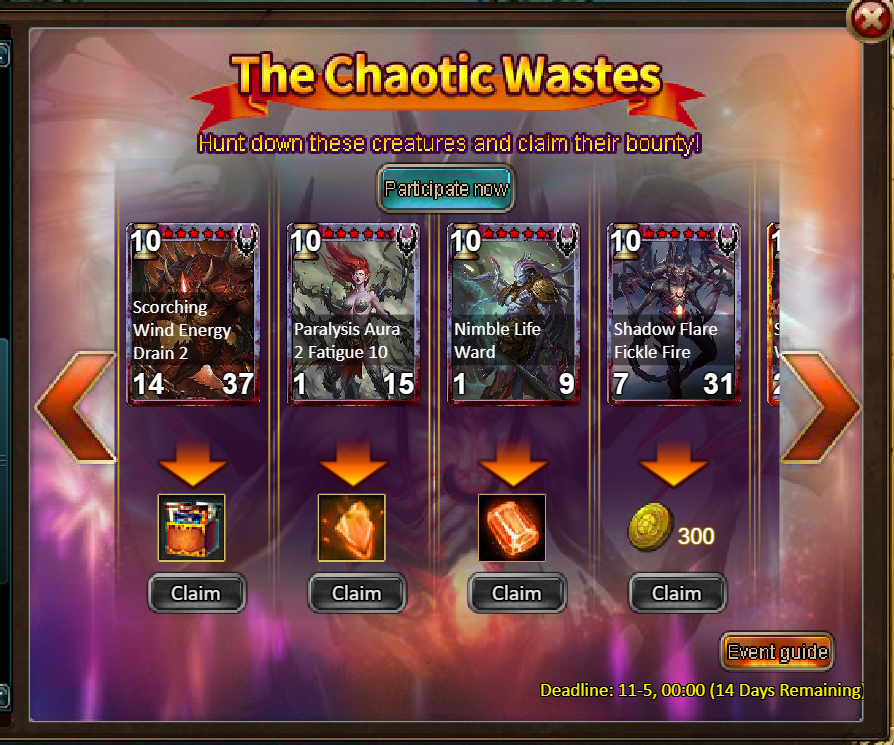 Consume 5,000 gold coins: Sorceror Darke(Legendary)*1, Chaotic Wastes Ticket*5, Black Wind Wolf Fragment*15