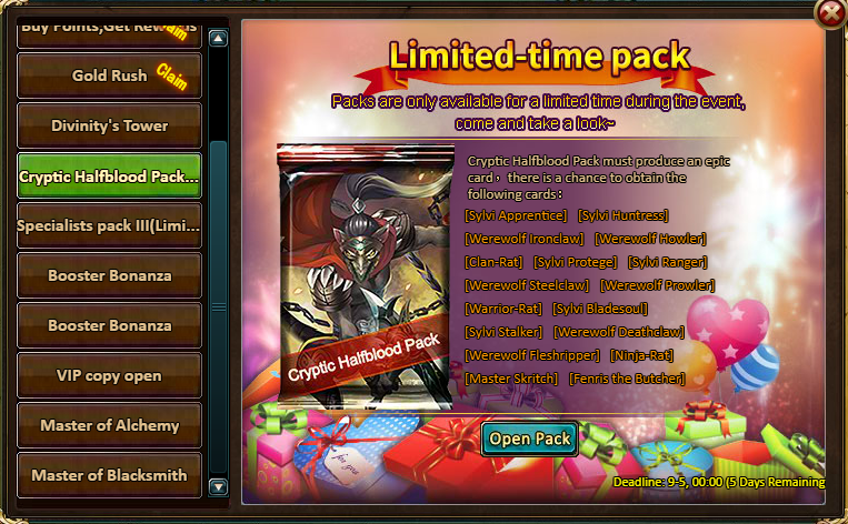 [i][u]20 packs of Cryptic Halfblood Pack - Fenris the Butcher (Epic)*1 / Fire Opal*1 / Silver*200,000