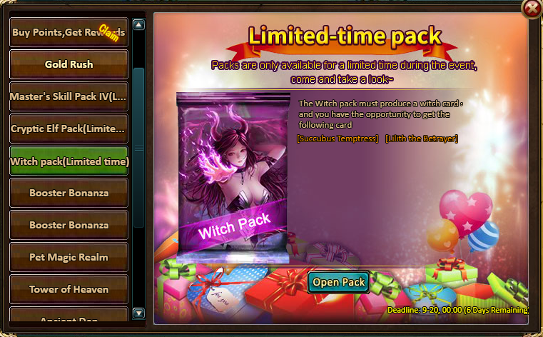 10 packs of Witch Pack - Legendary Box *1 / Pet Magic Realm Ticket *2 / Silver*200,000