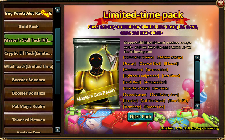 [u]20 packs of Master Skill Pack IV - Libra (Legendary) *1 / Silver*1,000,000