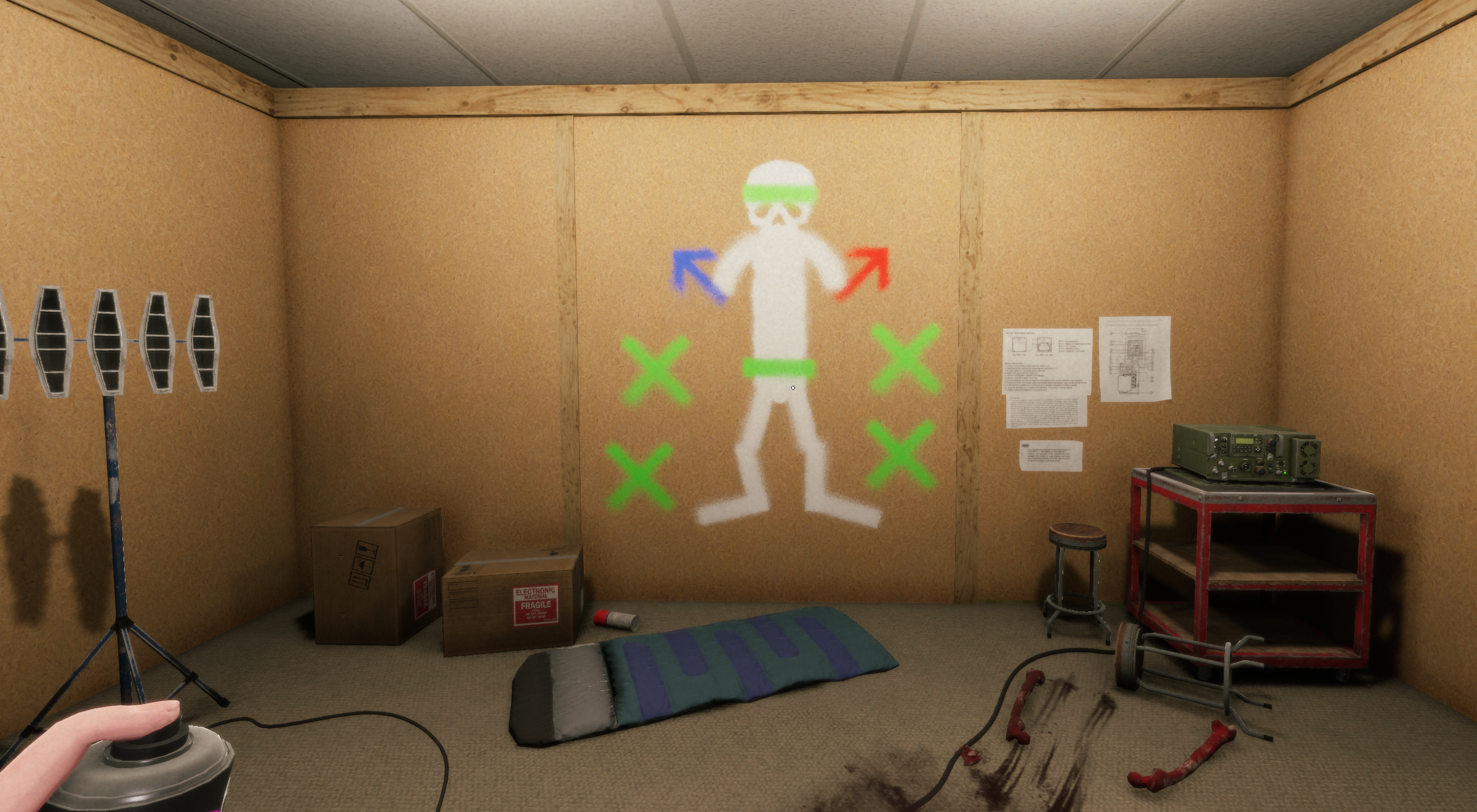 The spray can has four different colours which can be accessed by holding right click (or the relevant VR controller button). You also have access to eight different symbols which you can cycle using right click (or the relevant VR controller button). Sprays can be rotated by either holding left click and moving your mouse or by using the scroll wheel prior to spraying (for VR players, you can just rotate your hand freely).