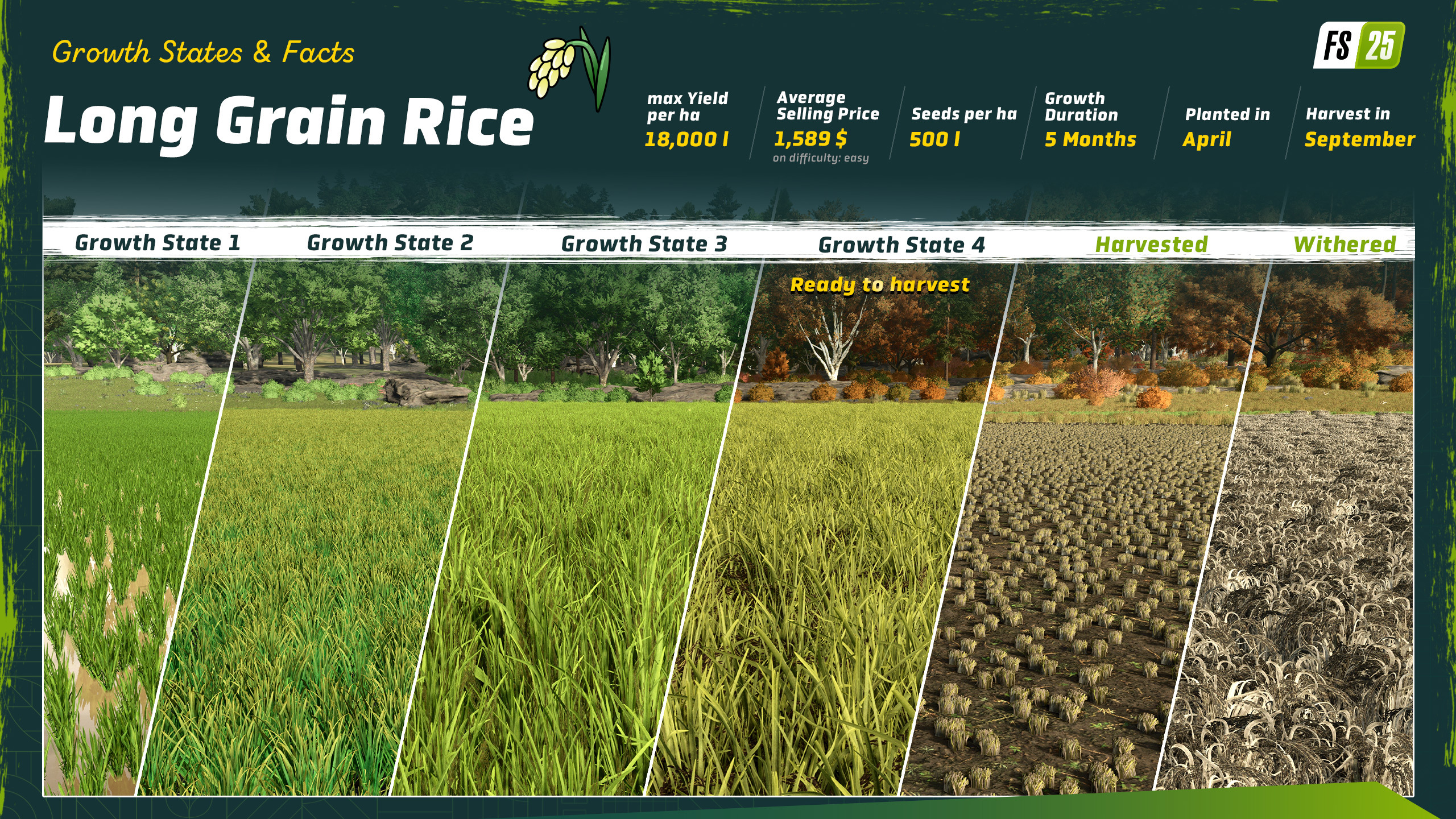 Rice and long grain rice need different water levels, machines to sow and harvest, and seeds, of course. Long grain rice isn’t sown in water like the other one. Instead, the rice paddy for long grain rice gets flooded AFTER the sowing, not before. But let's start at the beginning!