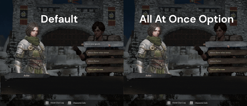 By default, dialogue appears on screen as if being typed out, mimicking a typewriter effect. However, for players who prefer to read the entire dialogue instantly, we’ve added an option to display all text at once.