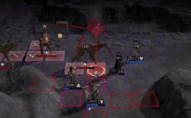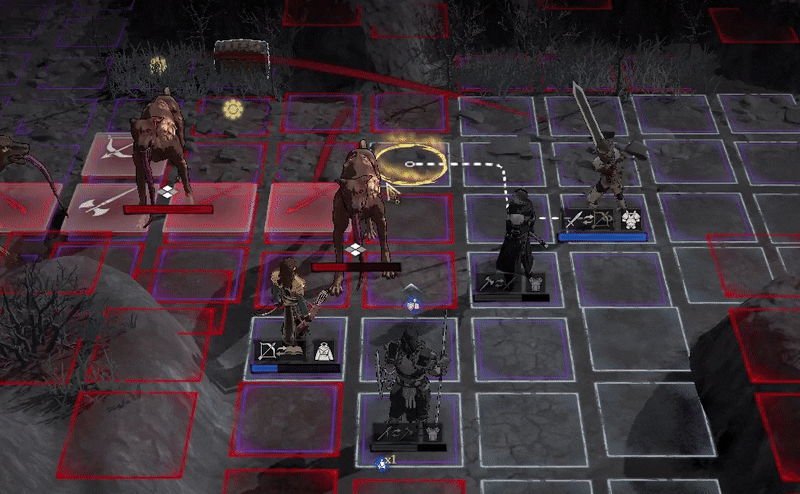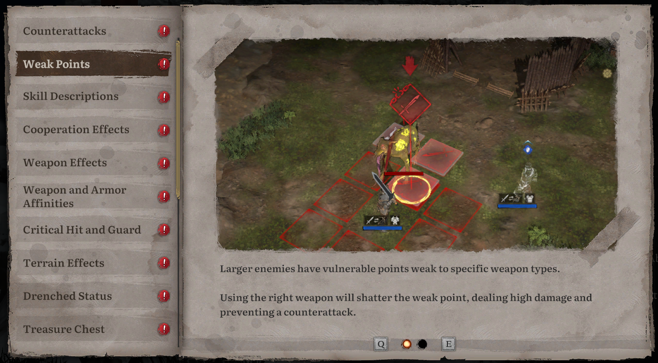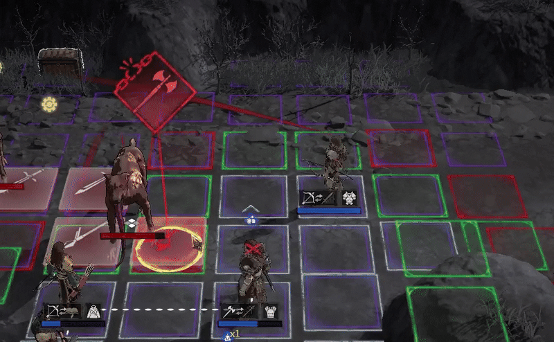 Unlike regular enemies, large monsters occupy multiple tiles on the battlefield. These can range from smaller 2x2 monsters to even larger 3x3-sized ones. Each turn, some of the monster’s tiles will randomly display weapon icons, indicating the monster’s current weaknesses. Three tiles for 2x2 monsters and four tiles for 3x3 monsters. Attacking these tiles with the corresponding weapon type will deal significantly higher damage and prevent counterattacks. However, using an incorrect weapon will result in lower damage output and leave the attacker vulnerable to an immediate counter. Additionally, monsters rotate in the direction they are attacked from. This movement also shifts the position of their weakness icons, meaning players must strategically plan their attacks to maximize damage.