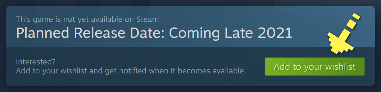 Adding games to your Steam Wishlist helps you by letting you know about updates and releases relevant to a game, but for developers like me, it's an incredible tool that lets Steam know that this is a game that people might be interested in! So please, take a moment, and make sure to click that beautiful green "Add to your wishlist" button.