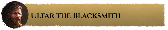 [b]Ulfar is a skilled Blacksmith[/b] who can [b]craft Weapons, Shields, and Mail or Plate Armor[/b] for you. He can also [b]smelt raw ores[/b] you have gathered.