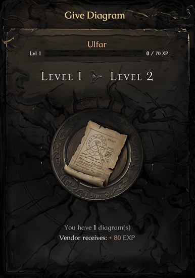 [b]Crafting gives the most XP[/b] to Artisans [b]when the Diagram Level matches theirs[/b]. More experienced Artisan Vendors gain less experience from lower Diagram Level crafts, so it’s [b]always a good idea to craft Diagrams as they become available[/b] - provided you have the Materials for it!