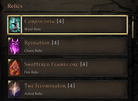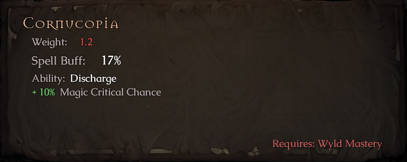 One example of these powerful Relics is [b]Cornucopia[/b], a Wyld Relic which, like all Relics, offers the Discharge Ability - and it [b]provides you with a potent 17% Spell Buff and +10% Magic Critical Chance[/b].