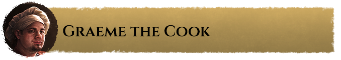 [b]Graeme can cook delicious food for you[/b], which you can use to restore or increase your Health, Mana or Stamina. The higher his Artisan Level is, the better food he can provide using the ingredients you collect.