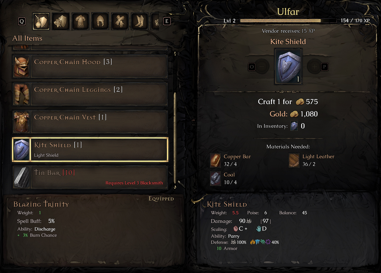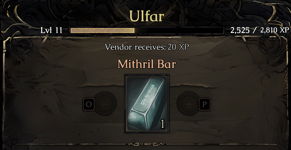 The [b]top right[/b] part shows [b]detailed information[/b] about the [b]experience of Ulfar, the crafting cost of the selected Item and your Material stocks[/b].