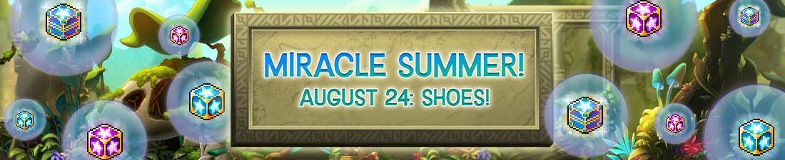 This [b]Saturday, August 24, 2024[/b], Maplers on all Worlds will have Miracle Time enabled for [b]Shoe Equipment[/b]! Cube your boots, slippers, sandals, sneakers, trainers, tennis shoes, high-tops, and more all-day Saturday with the improved Rank-Up chances!