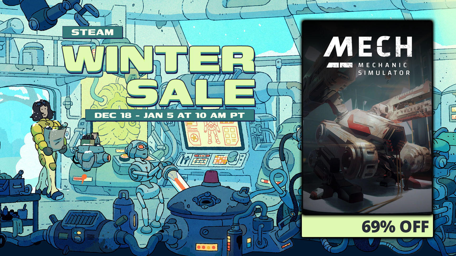 Mech Mechanic Simulator is joining the celebration as well. Until January 5, you can get the game with a festive 69% discount.