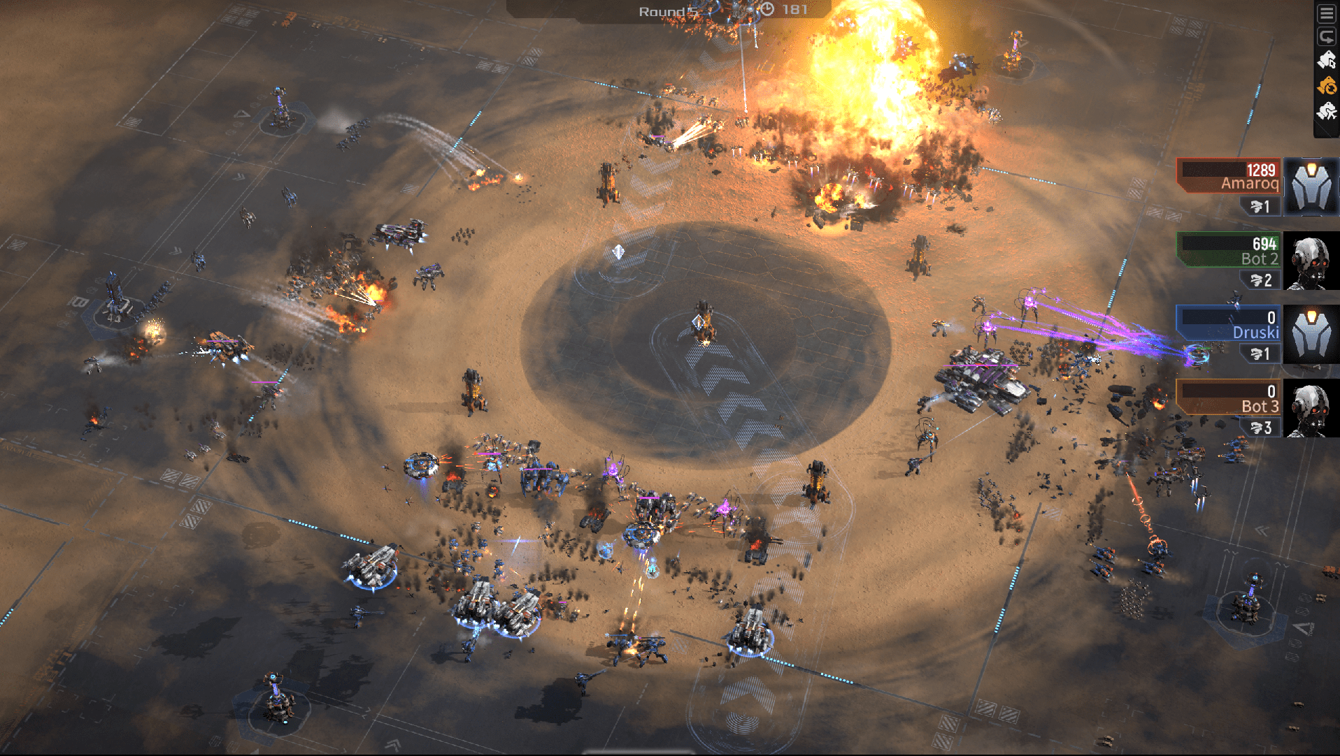 4-Player Brawl offers a new way to play, that stands as a compliment to already established Mechabellum meta. The mode is a combination of a Free For All battle with PvE elements. You'll face off against three other players, while also contending with an NPC faction located in the middle of the map. The players' objective is to accumulate points for eliminating your opponents, while also destroying Supply Ships in the middle of the map to afford more units and upgrades in each round. The player that gets the specified amount of points first, wins the whole match.