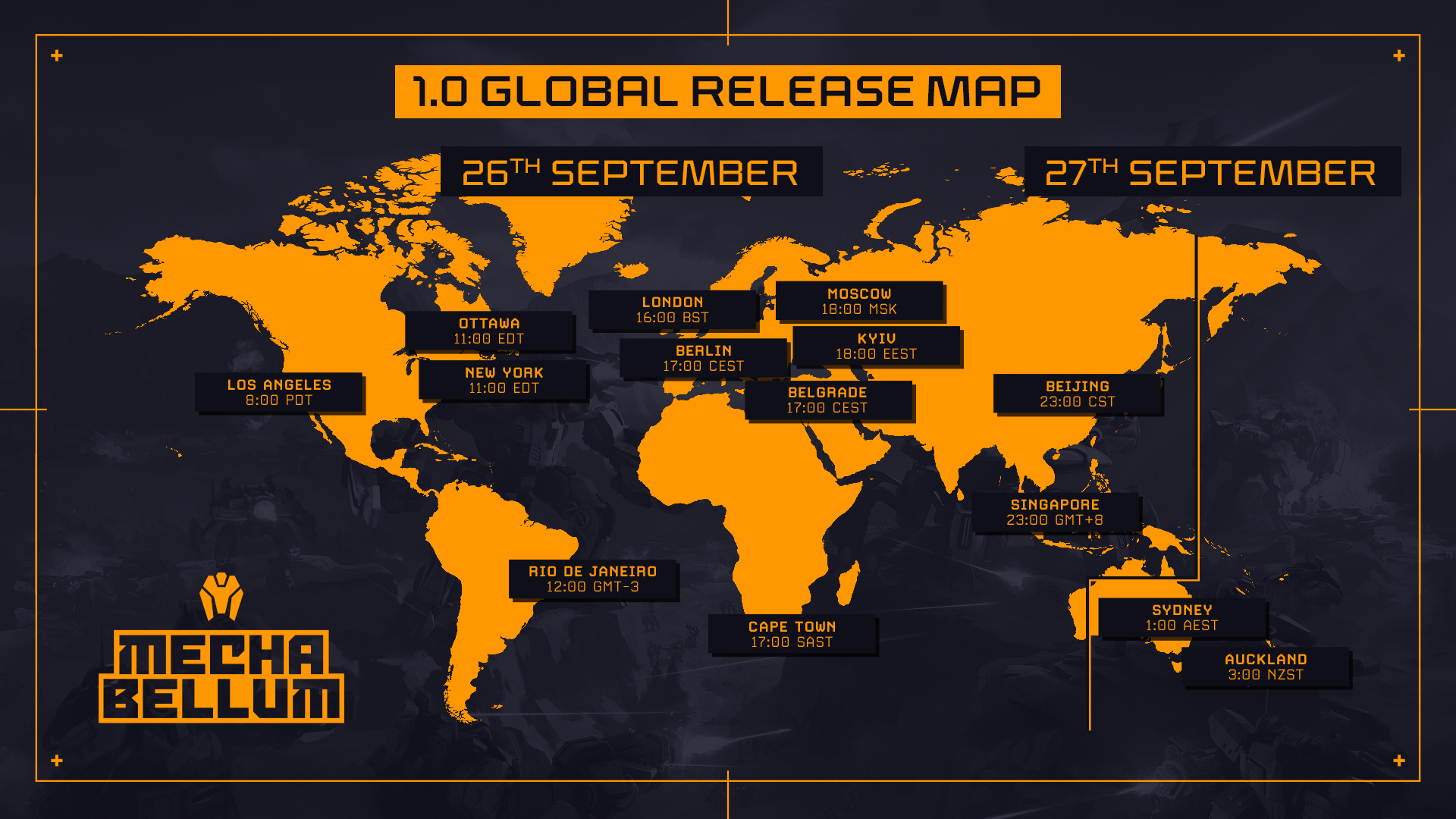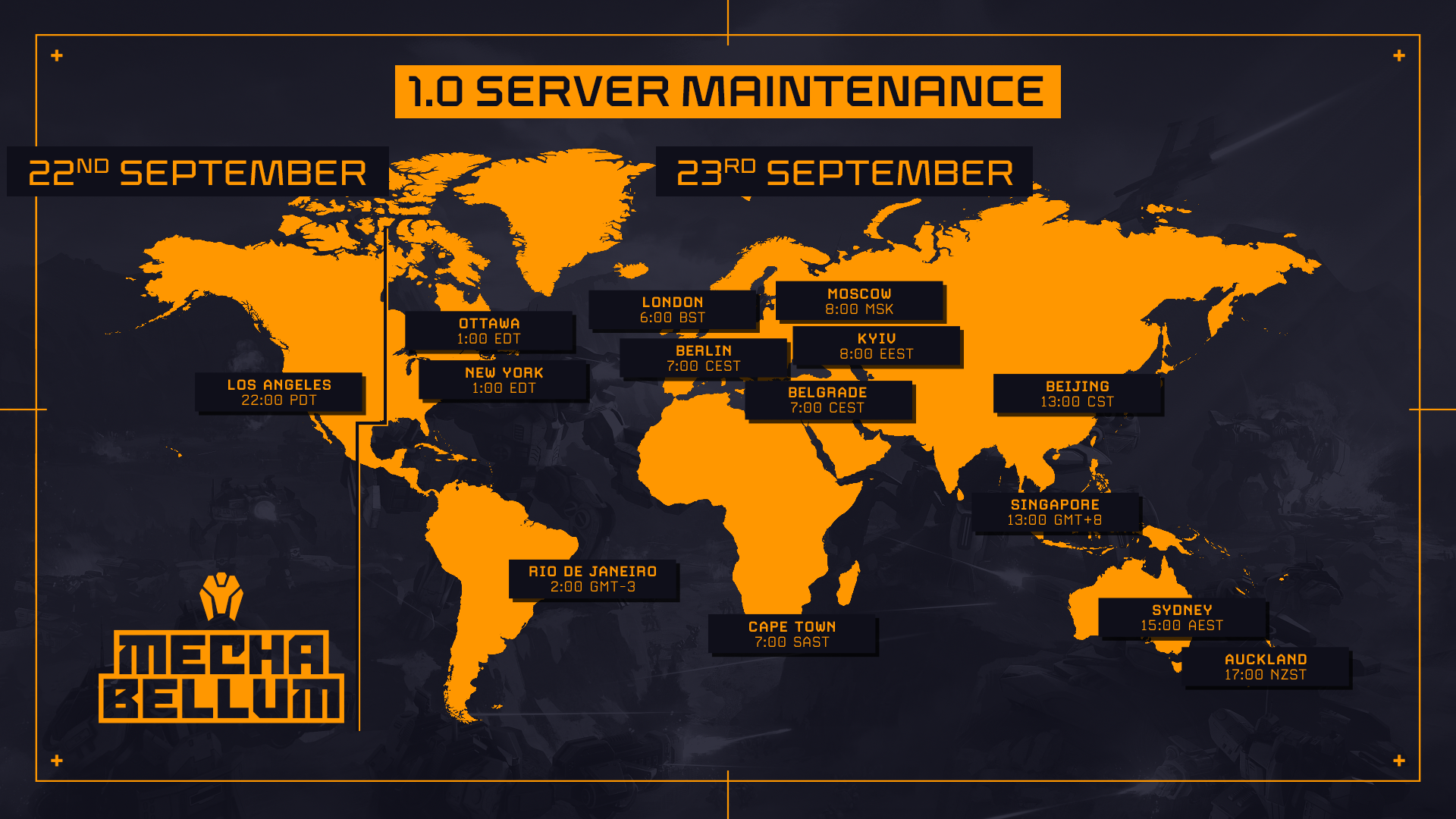 Launching Mechabellum in 1.0 will require a longer than usual server maintenance. We’ll take the servers offline on September 23rd, for a period of 8 hours, at 5a.m. UTC.
