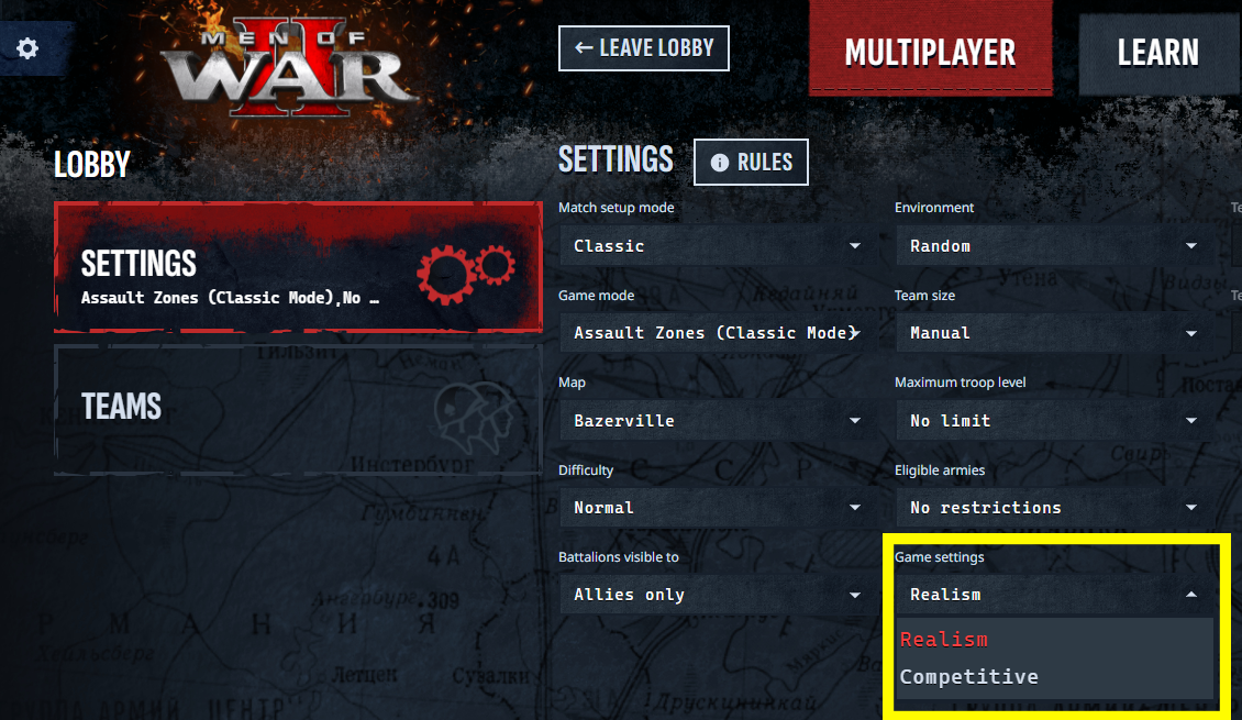 We have introduced a whole new category in the Lobby, and that is "Game Settings" - which can now be switched between "Competitive" (the experience you are familiar with from previous Men of War II playtests) and the newly added setting called "Realism".