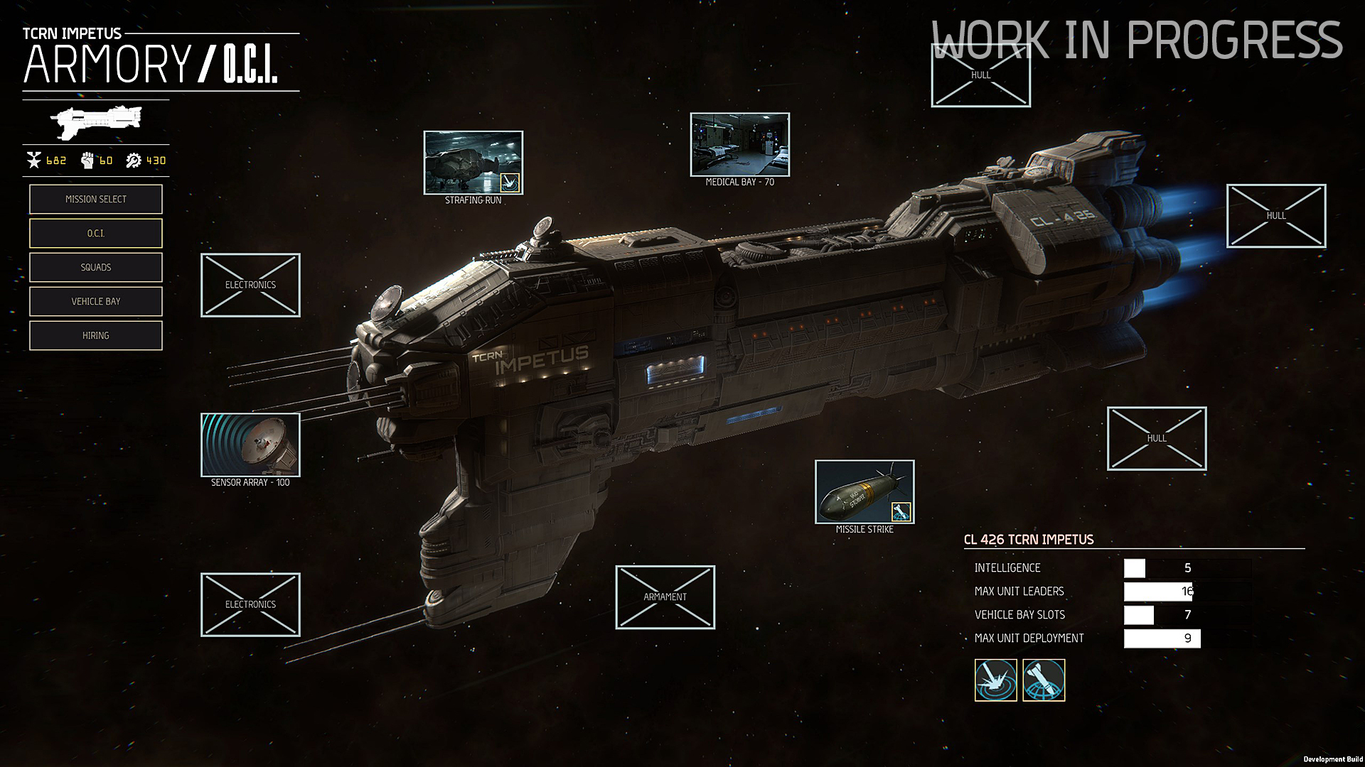 [hr][/hr]OCI meaning “[b]Operational Capability Improvement[/b]” are upgrades and ad hoc installations that are executed while the ship is in active service. These OCIs come in three types: [b]Armament[/b], [b]Electronics[/b], and [b]Hull[/b]. The Impetus has 10 available slots for installing OCIs (this number may still vary). 3 for Electronics, 3 for Armament and 4 for Hull upgrades. While upgrades of a certain type have to be built into the corresponding slot, each upgrade can be installed multiple times and the effects will stack. We currently have around 50 OCIs planned and will be adding more during Early Access. This allows for an almost unlimited build variety and each player will end up with their very own configuration of the TCRN Impetus. Typical OCIs are things like a med bay to heal infantry squads between missions or a sensor array to provide more detailed information on enemy units before a deployment. Stacking up these OCIs will heal squads even faster or provide even more detailed information respectively.