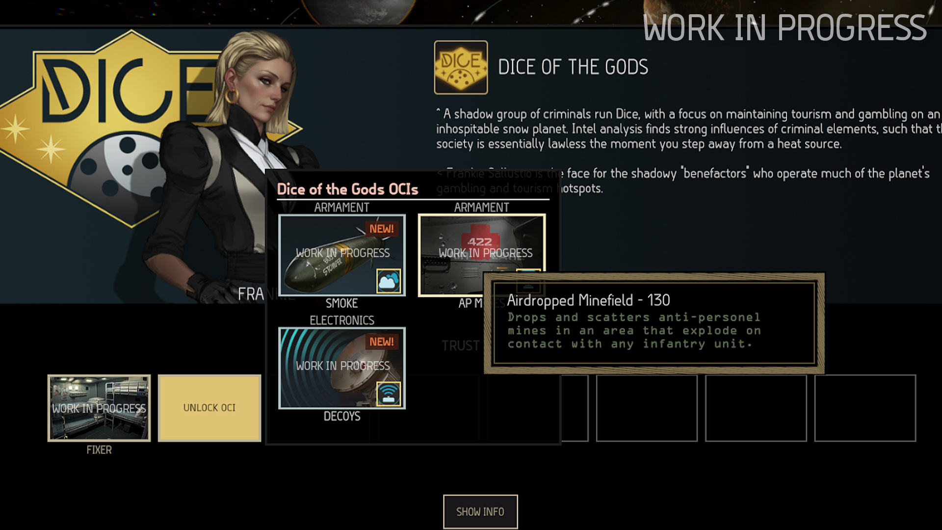 [hr][/hr]Acquiring OCIs in MENACE comes with two prerequisites. First of all an OCI has to be unlocked and made available for installation. Then the actual installation of the upgrade requires a resource called “components” (this name is not final). Although a few very basic OCIs are permanently unlocked right from the start of the game (unguided missile strike, medical bay, sensor array, vehicle repair bay and dropship strafing run) things will get a lot more interesting once you gain trust with the local factions and get access to more specific and advanced upgrade options for the Impetus. Increasing trust with a faction happens mainly through accomplishing operations in their favor. Each new level of trust will unlock a new OCI and make it available for installation. Bear in mind though that losing trust with a faction might also reduce your OCI options again. The “components” needed to install OCIs are gathered by completing operations in the Wayback. The amount of components earned depends on the length of the operation and your overall operation rating. Individual missions do not earn components, the whole operation (a series of missions) has to be completed successfully in order to gain components for OCIs.