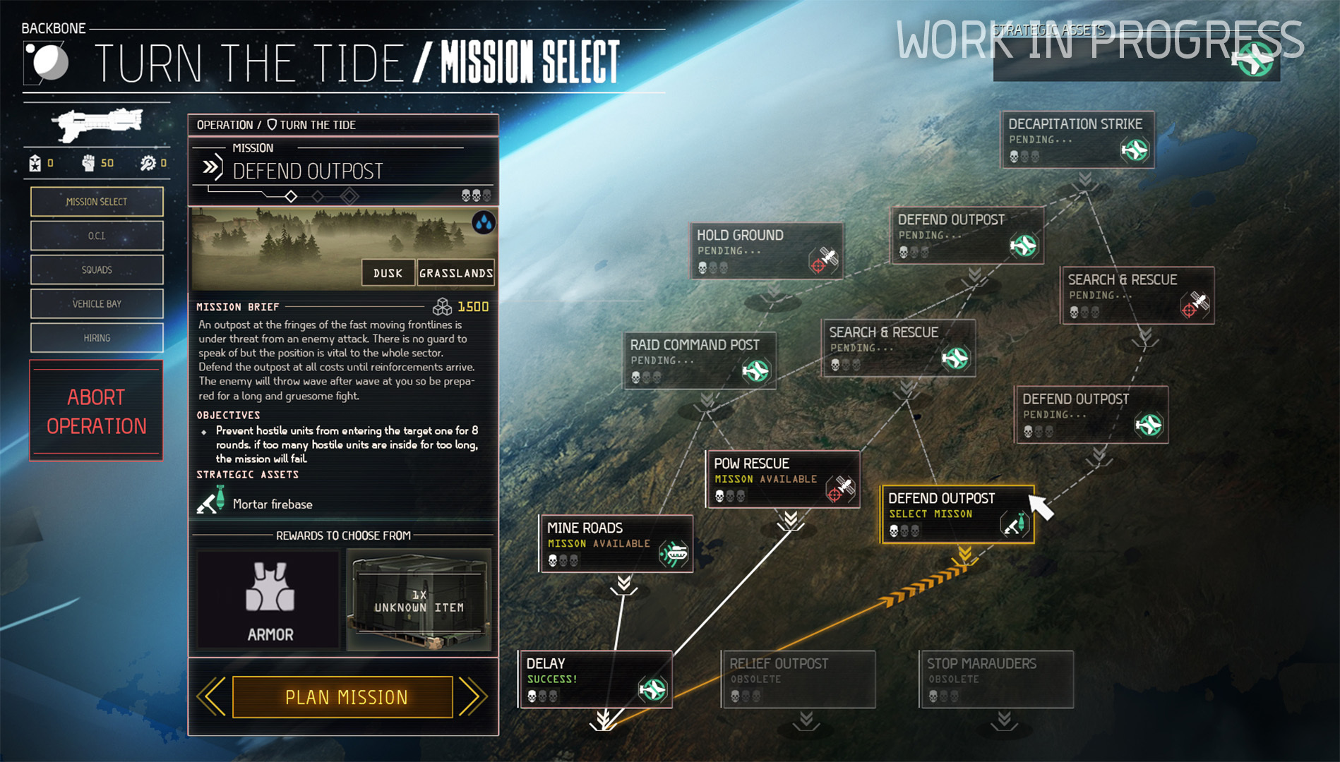[hr][/hr]Operations are, on the most basic level, a series of 3 to 5 missions. Each mission is a single tactical battle fought on a procedurally generated tactical battle map. The missions are connected in a tree-branched fashion so that players have a choice of which mission to take on next on each level of the operation. All Operations will resolve in a single final mission, but the nodes before will usually offer more than one mission to choose from. It is important to note that only one mission can be resolved on each level, so the player can not backtrack or do multiple missions on a certain level. All vehicle losses and damages will carry over between missions as well as elements lost in squads, so players have to be extra careful to not take too much damage early in the operation or to ensure that they have enough reserves to replace losses. Once an operation is completed, certain rewards are gained, and all squad elements are refilled and vehicles repaired. Squad Leaders or Pilots who permanently die will, of course, not return. The same goes for vehicle chassis, as they can also be permanently destroyed.Operation Rewards