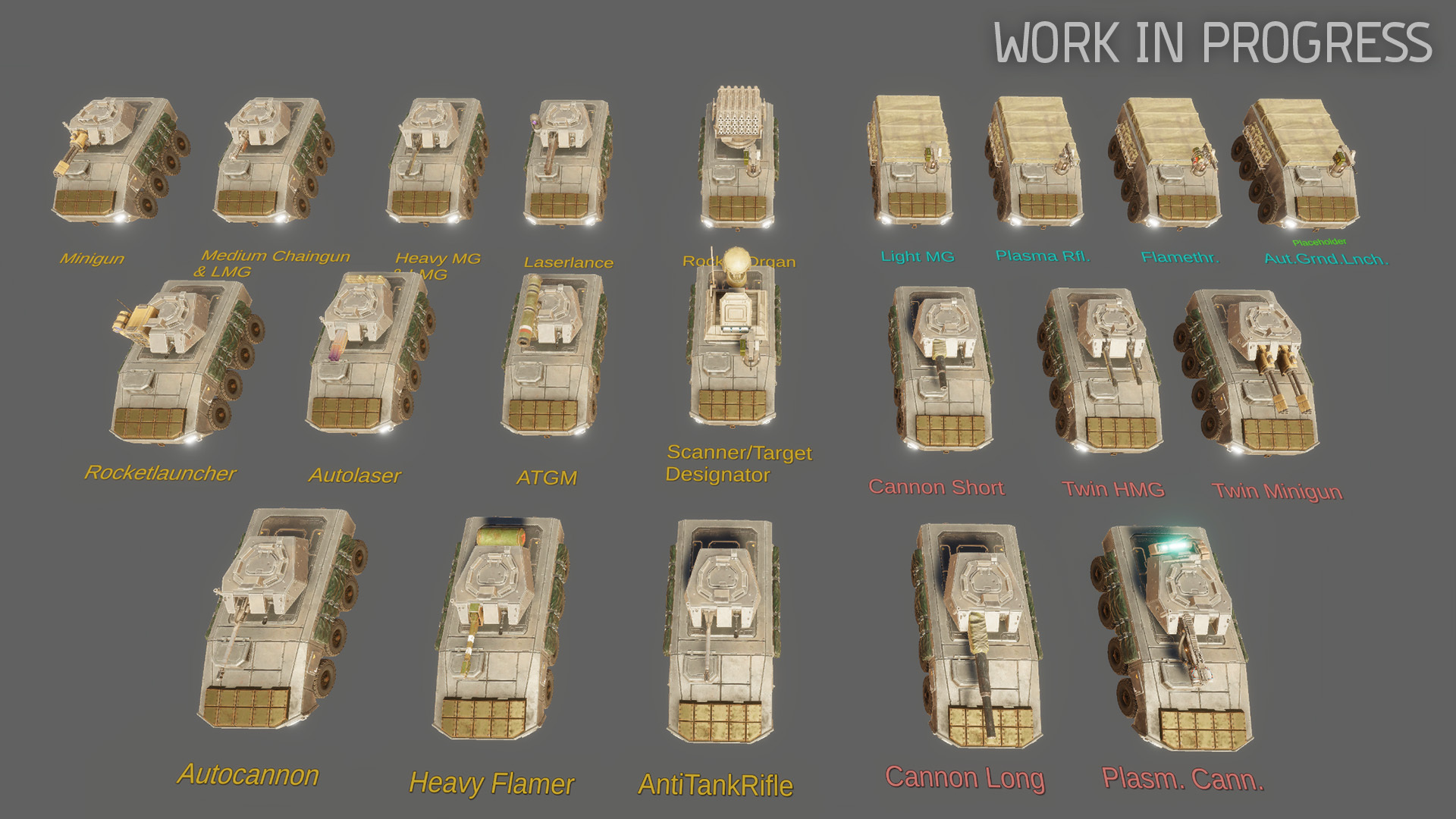 [hr][/hr]The 3D department is focusing on implementing the dynamic vehicle weapon system, which allows the player to equip their vehicle chassis as freely as possible with all available weapons. We showed a basic concept in an earlier Dev Diary. Now, the system is actually shaping up and will soon be ready to be implemented. This gives the same freedom you already have when equipping squads to the vehicles and allows for an insane number of weapon load-outs.