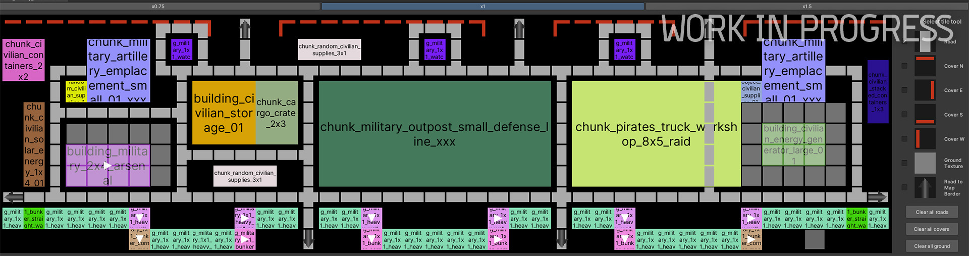 [hr][/hr]Our main focus at the moment is adding more operation types to the game. Right now, we are working on another operation type for the pirate faction. Each enemy faction will have multiple different types of operations, each consisting of a unique set of missions. Of course, we will keep adding more operations during development. Below, you can see a screenshot from our chunk system editor, which we use to create templates for procedurally generated parts of the map. In this case, it's a rogue forces defense line for the “breakthrough” mission type.