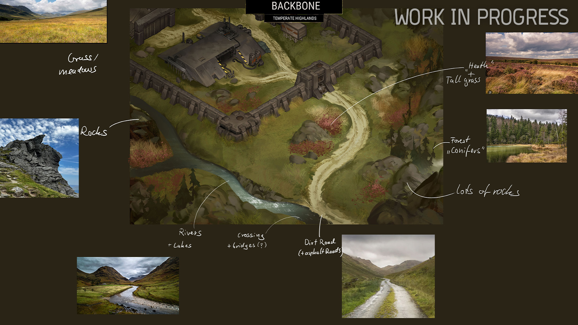 [hr][/hr]As we are in the process of onboarding a technical artist, we are preparing some rough concepts for different subtypes of biomes for each of the game's classic biomes. In this example, the basic biome would be called “temperate” as you would find it on the planet “Backbone”. The different subtypes of biomes would be temperate highlands and temperate marshlands. Bear in mind that these concepts are just a very basic guideline for tech art, intended to illustrate roughly what we are aiming for.