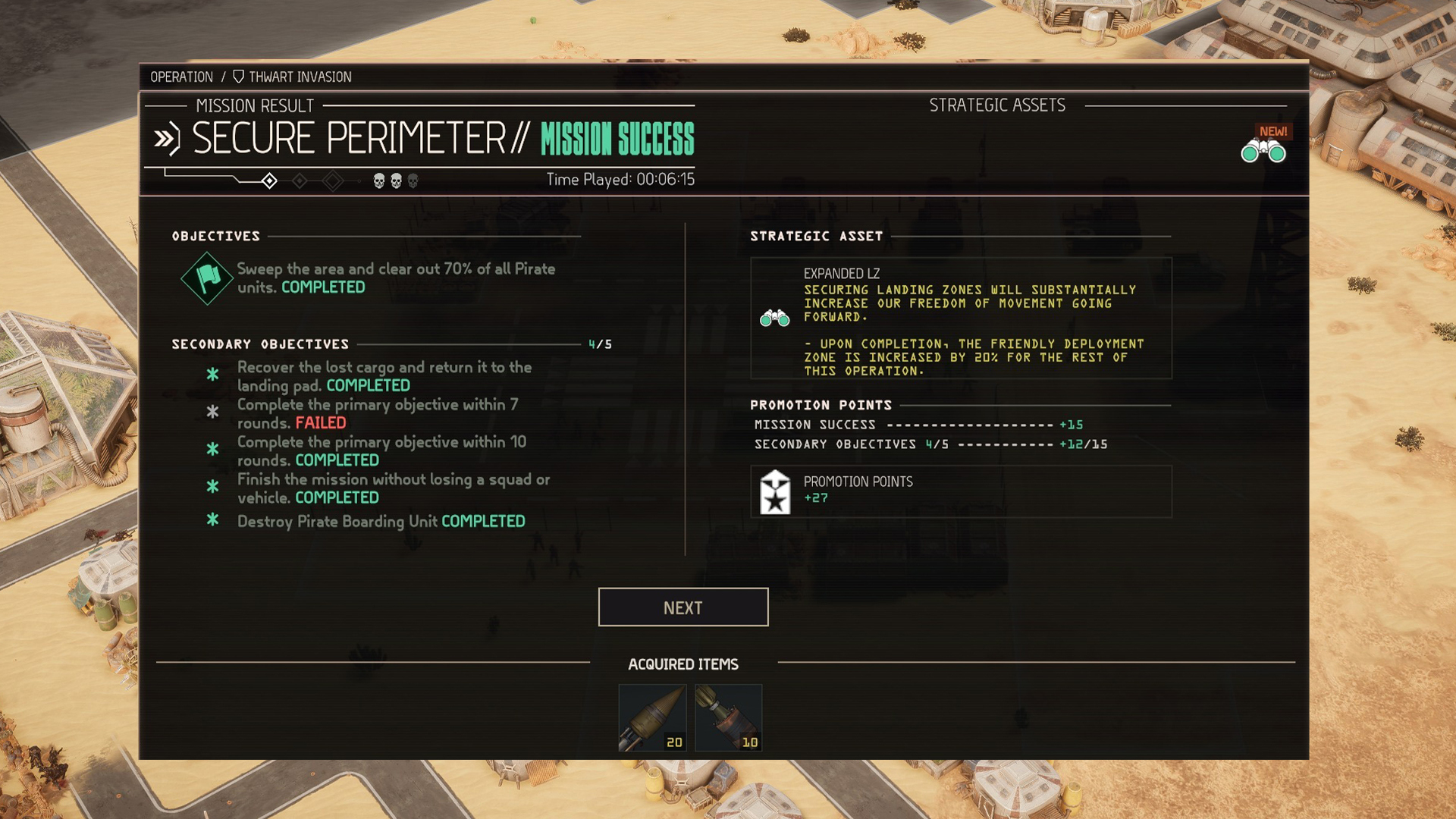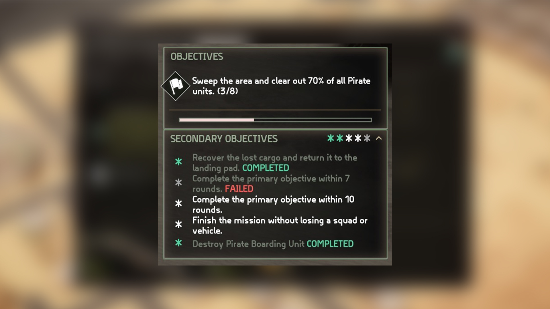 [hr][/hr]To start, we removed all hidden factors from the player rating and split it into two base factors: Primary objectives and Secondary objectives. The Primary Objective is always defined by success or failure, depending on whether the primary mission objective is completed. Completing the Primary Objective alone will grant 15 promotion points and a zero-star rating. To earn a higher rating and more Promotion Points, players must complete the all-new Secondary Objectives. Each mission will have between 1 and 5 Secondary Objectives, each granting additional rating points, with a maximum of 5. The Secondary Objectives are, for example, completing a mission without losing a squad, killing a certain number of enemies, finishing the mission within a specific timeframe, or completing the Primary Objective exceptionally well. Each Secondary Objective completed grants a 1-rating start and three more Promotion Points. Important: All of these numbers are examples and are being used for testing right now. The amount of points earned for Primary and Secondary Objectives will most likely change. Secondary Objectives are handcrafted for each mission, and while many missions will share secondaries, we can create a unique set for each mission. Over time, we will, of course, add more secondaries and change them around to balance.