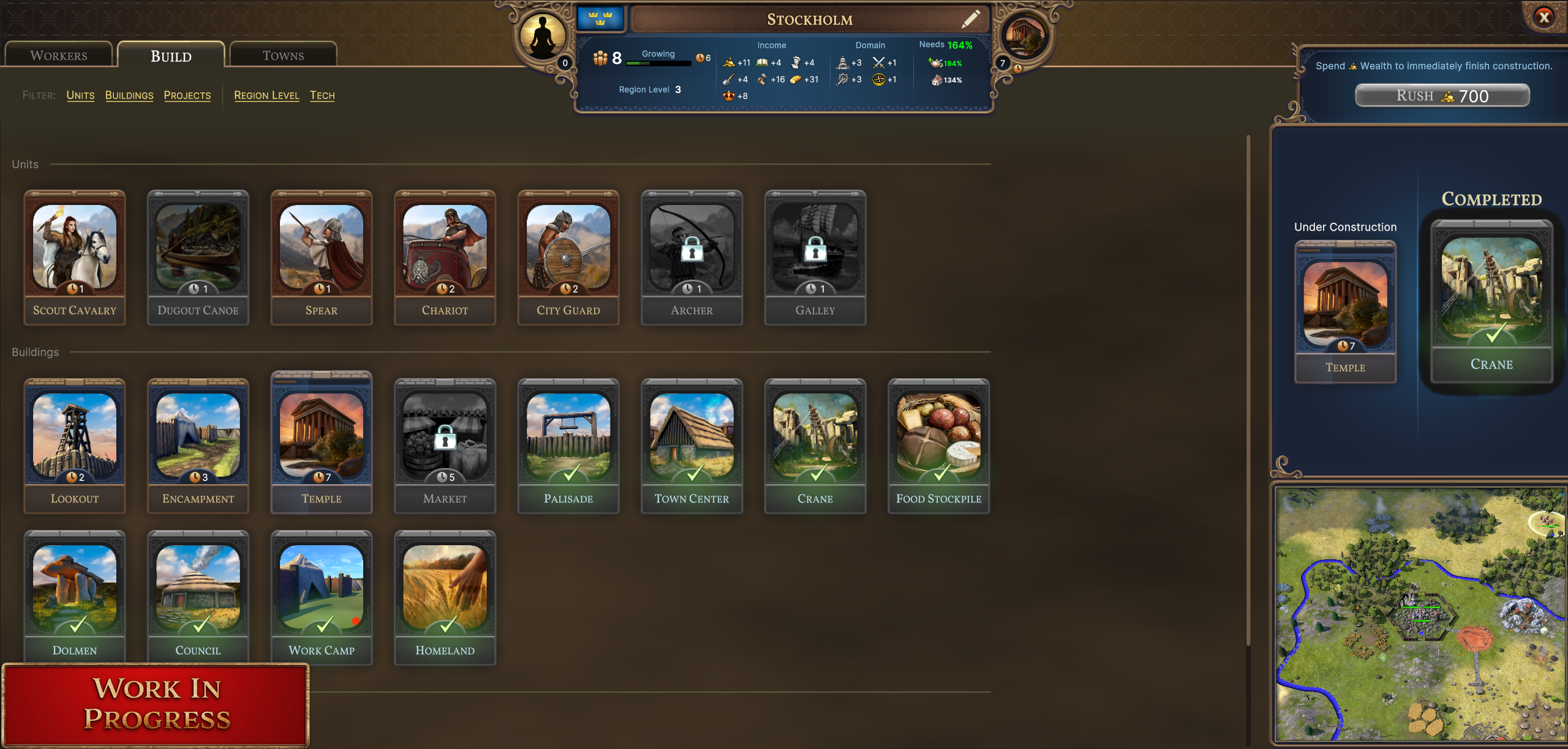 At the start of the game, you control a single Region. Regions are the most vital element of the game economy – they define your borders, allow you to put your people to work, and let you build Units and Buildings. The Capital at the heart of a Region will feel pretty familiar to players comfortable with other 4X games, particularly at the start. Grow your Region’s population to work more tiles, collect more resources, and become an industrial powerhouse. At a high level, the Region’s Population determines how many workers you can assign, while the territory controlled by the Region determines what those workers can be assigned to. Early on, many of your workers will be “foraging”, gathering from the land directly. This type of gathering is 1:1, so if you have 3 Forests, you can assign up to 3 workers to foraging in those Forests. This is fine for getting started, but to really get your economy rolling you will want to build Improvements, such as Farms and Hunting Camps … or Oil Wells and Computer Factories when you reach the more advanced Ages. Improvements dramatically boost the value of workers in a Region, providing Goods that are worth significantly more than what foraging alone can generate (of course if you have the right National Spirit perhaps there are some alternative strategies you can find…). Regions can also be strengthened by constructing “Capital Buildings”, which are permanent upgrades to the Region. These represent infrastructure, monuments, and other ways to improve your Region as a whole. Like Improvements, there are a huge range of these, providing additional resource income, army enhancements, and other bonuses.