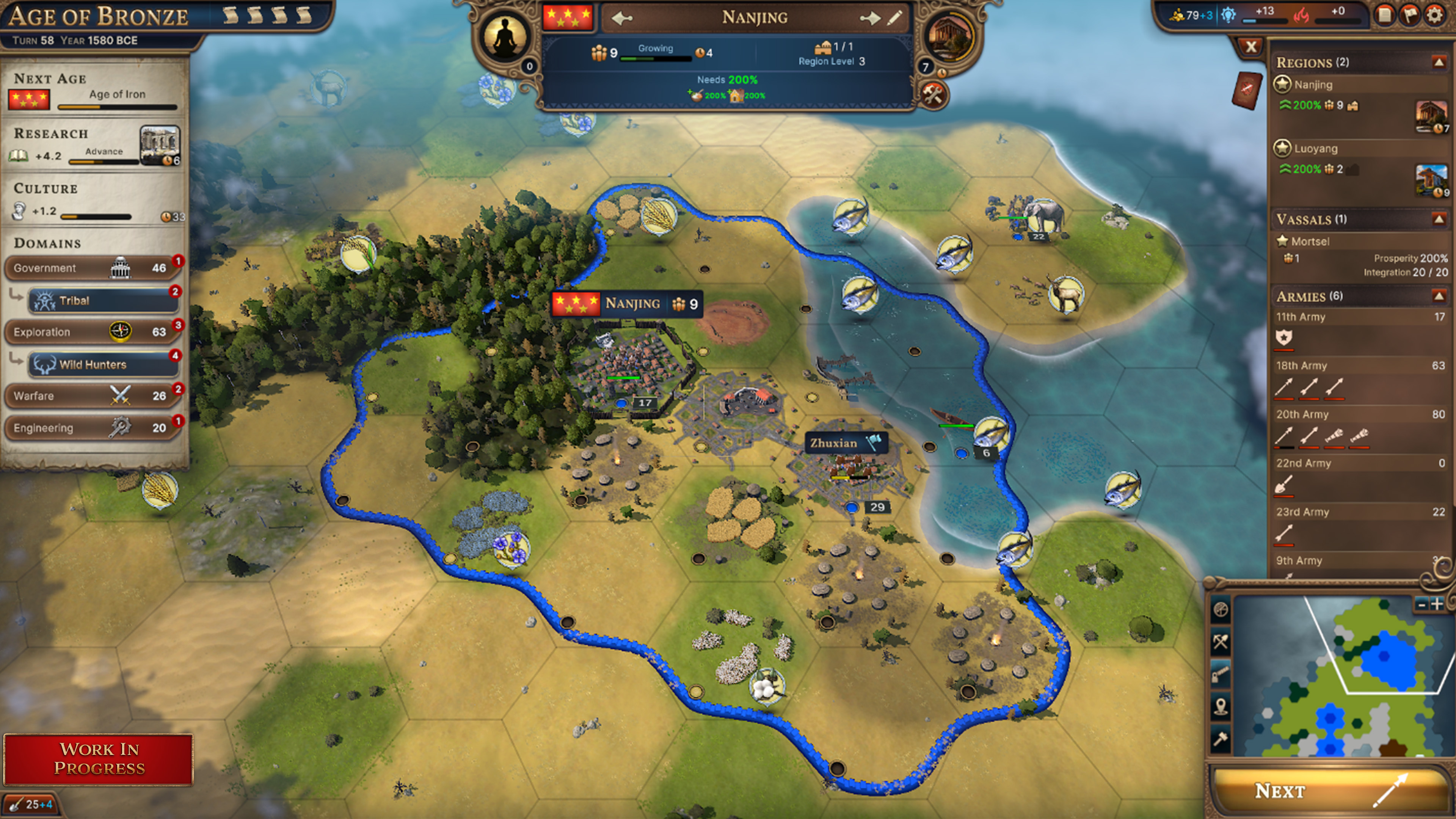 Despite being the first turn of the game, with only one Region and a few Units to control, there’s lots of decisions you need to make to get the ball rolling. I normally focus on building farms and keeping my Needs met at 200% as much as possible. I use my starting Warband Units to clear the fog of war around my starting area, supplemented by one or two Scouts I’ll build. I try to collect Reward Camps and stomp out any Barbarian Camps I see to hopefully get something helpful to rocket myself into a good position.[b]Bronze C. 5,000 B.C.E.[/b]