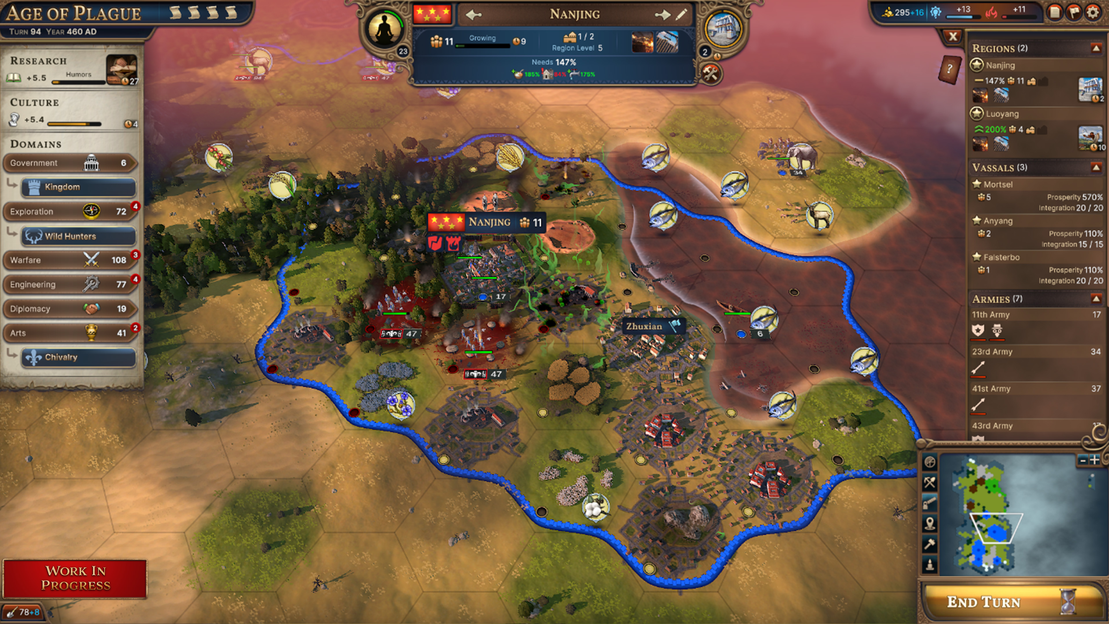I like reaching the Iron Age ASAP because I can reform my Tribal Government into a new Government. Which Government I pick depends on how my game is going, whether I have a lot of Vassals, or if I’m better off keeping my borders close-knit and just focus on keeping my Regions growing. By the Age of Iron, I also normally have a plan for how I’m going to get ahead of my neighboring Nations. If I’m lucky with the terrain near where I spawned, I can focus on investing in myself, getting my iron mines up and running, and continuing to chain together basic foods into more efficient refined goods. If I’m unlucky, I’ll have no choice but to invest in my military and train some Cavalry to harass my neighbors or try and steal an unprotected Vassal from them.[b]Kings C. 0 C.E.[/b]
