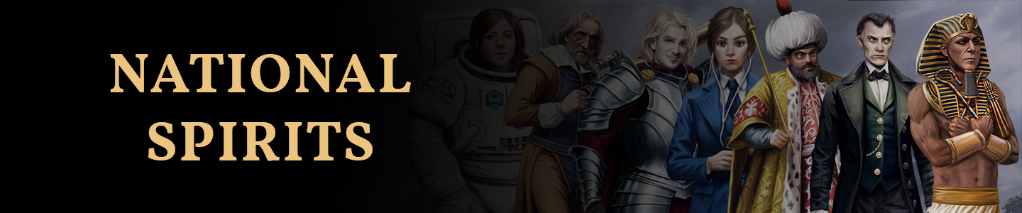 Think of National Spirits as “things a nation can be famous for.” Are your people known as great engineers? Is your nation seen as the center of global banking? Does the world fear your unbeatable warriors?