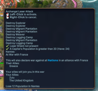 - Using an Archangel Laser Strike now negatively affects your diplomatic opinion with the targeted Nation. The reduction is based on whether you are de-shielding, damaging, or destroying a region, with the last of those being almost unrecoverable, diplomatically.