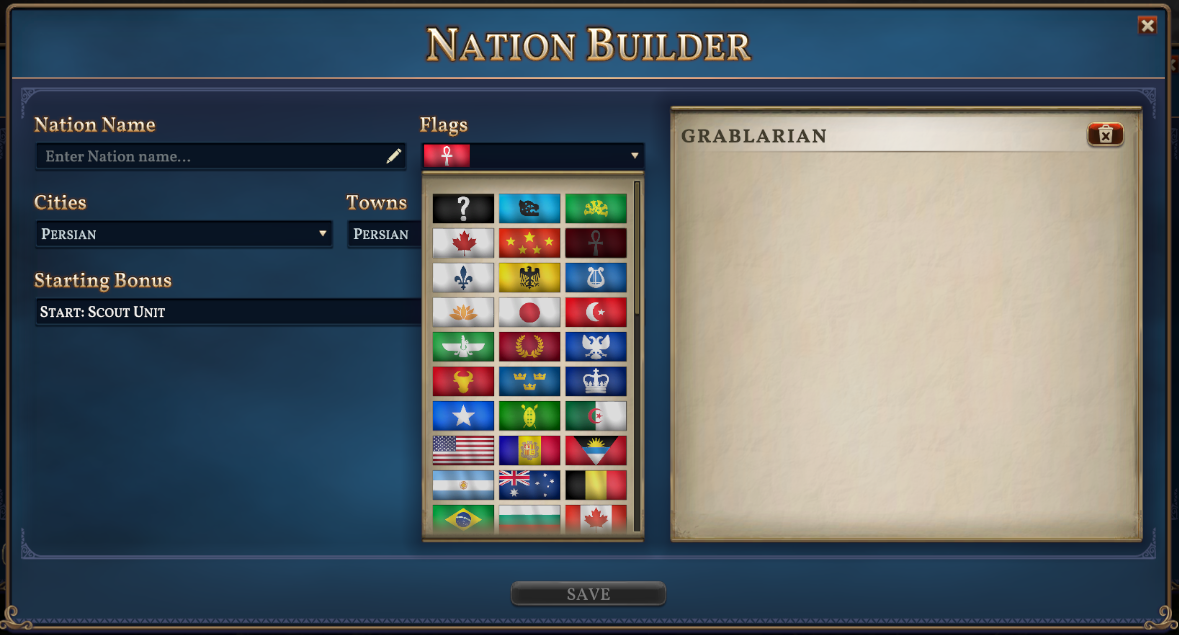 - Expanded the Nation Builder. Functionality has been added that allows the removal of player-made Nations from within the Nation Builder. Additionally, it is now possible to modify most aspects of existing custom Nations from the Nation Builder. Flag selection has been changed to a grid display.