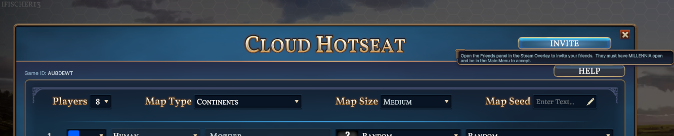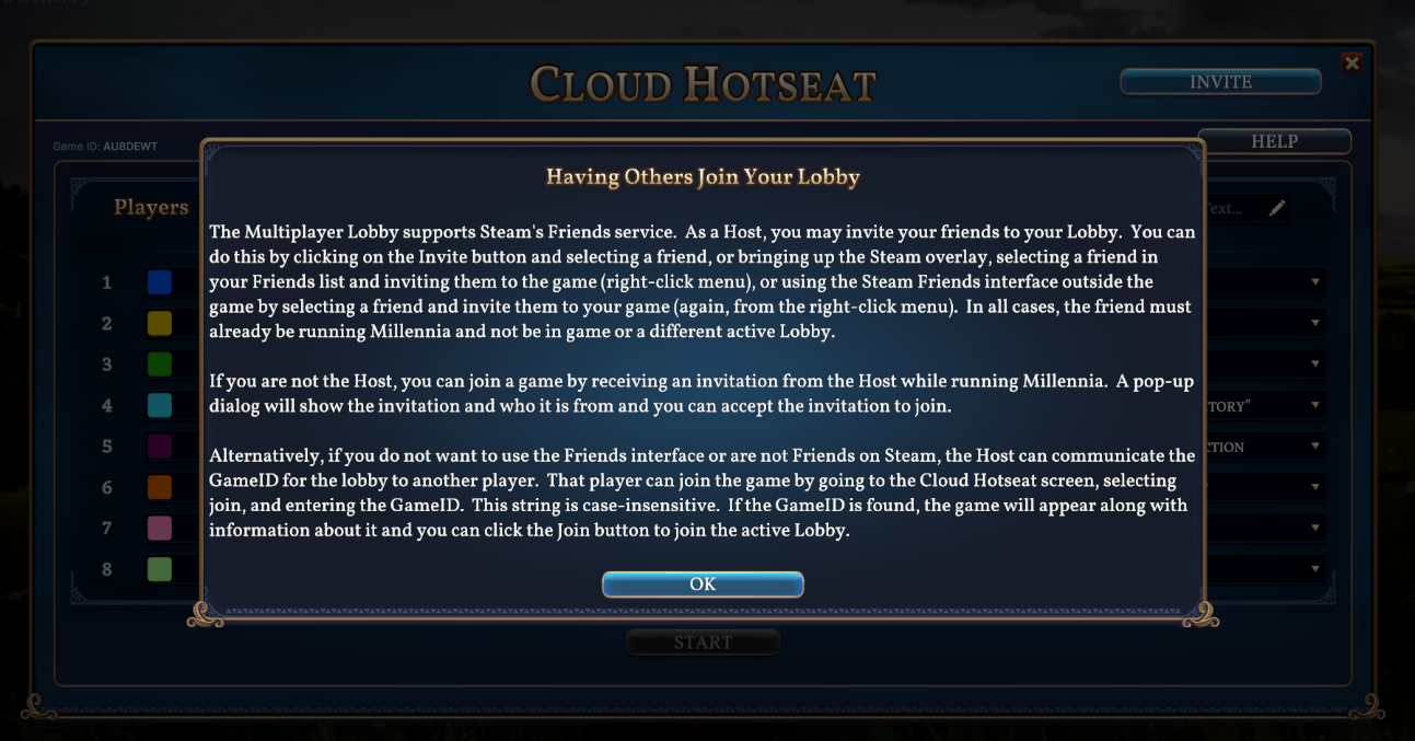 - Implemented new hotseat multiplayer functionality -- this replaces the system previously in place, which has been removed. When hosting, you can now click Invite in the upper right of the Cloud Hotseat UI to see your Steam Friends List and select a friend to invite. (You can also invite a friend by right clicking and selecting Invite to Game through the Steam Overlay.) If your friend is also running Millennia, not in and active lobby, and not loaded into a game already, they will receive a pop-up invite. Alternately, you can invite players who are not in your Friends List by sharing the Game ID displayed on the left of the Cloud Hotseat UI. Invited players then join the game by selecting Join and using the ID provided to them by the host.