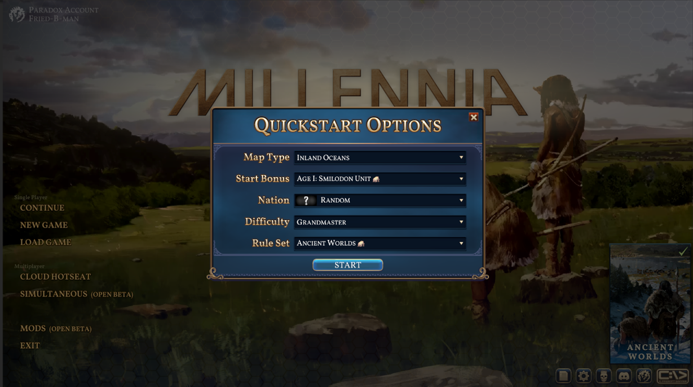 Millennia: Ancient Worlds is focused on the early human experience of scavenging the land for resources, hiding from or fighting dangerous predators, and eventually finding a place to settle down and start your Nation. As soon as you have the Ancient Worlds DLC enabled, you’ll have access to a new quick start rule set that will start a game with all of the new features turned on: