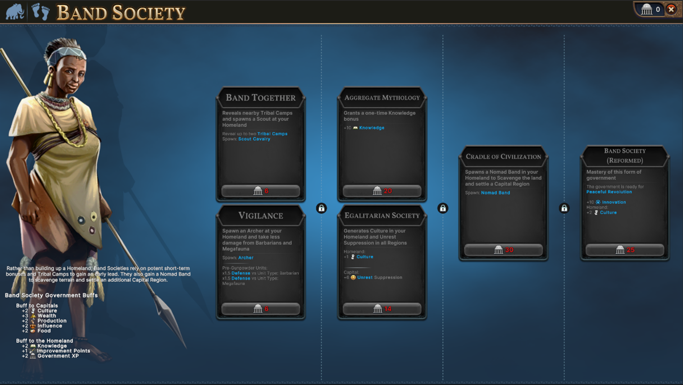 We wanted to have an alternative to Tribalism that felt like you continued to carry on the nomadic lifestyle. Within the constraints of designing a new Age 1 Government, we found that the best distinction was to separate out Tribalism as the “Homeland” and “Settled Down” Government type, and make Band Society the “Nomadic” and “Ephemeral” Government.