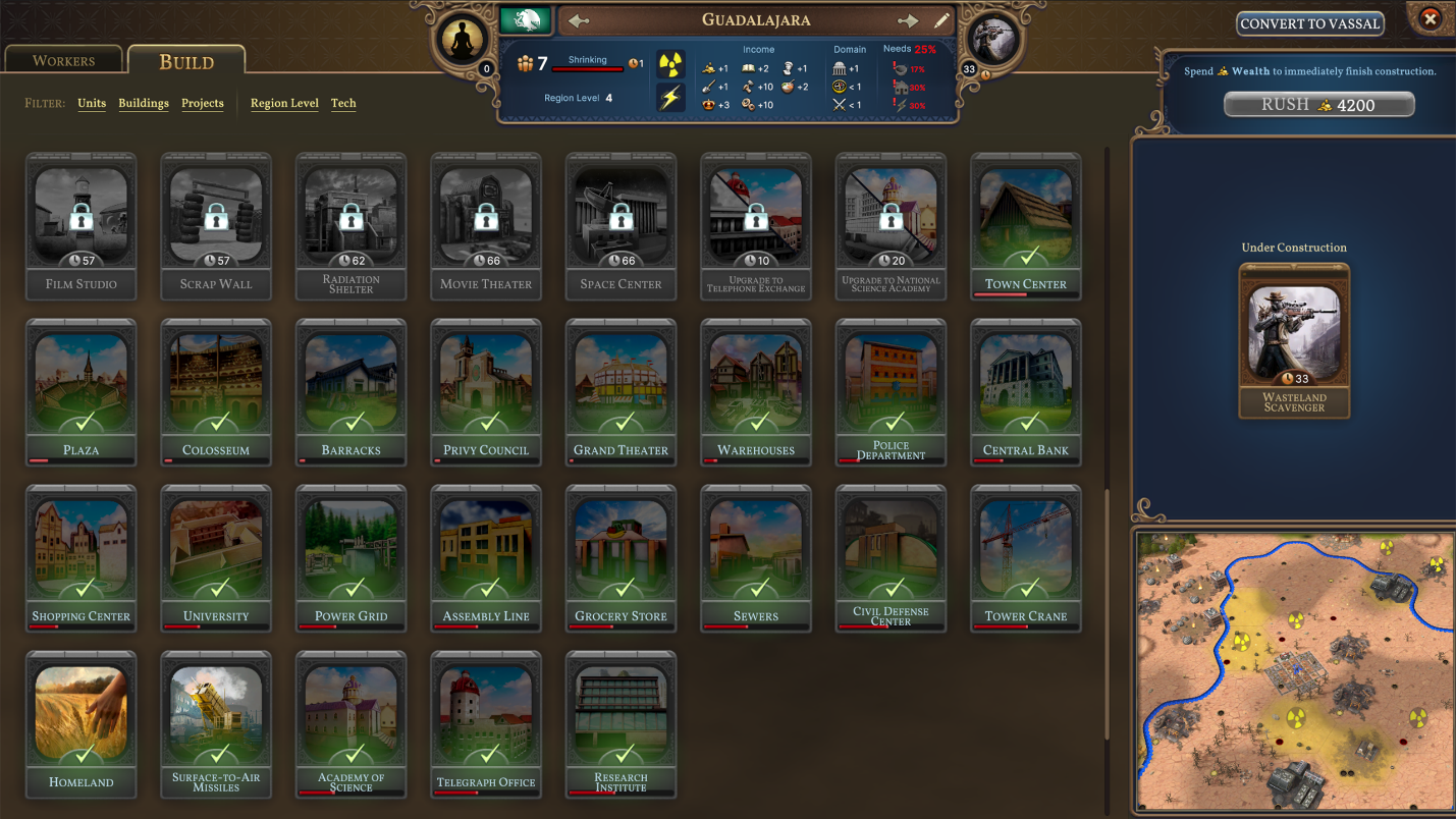 The potential future where global thermonuclear war wipes out the majority of the world’s population has lots of downsides, but the silver lining here is that you unlock cool new technologies on your path to rebuilding civilization! Discover new uses for Junk, find stockpiles of Canned Foods preserved in Old-World Ruins, and turn your precious Textiles into Rag Dolls to keep your Nation’s Unrest down.