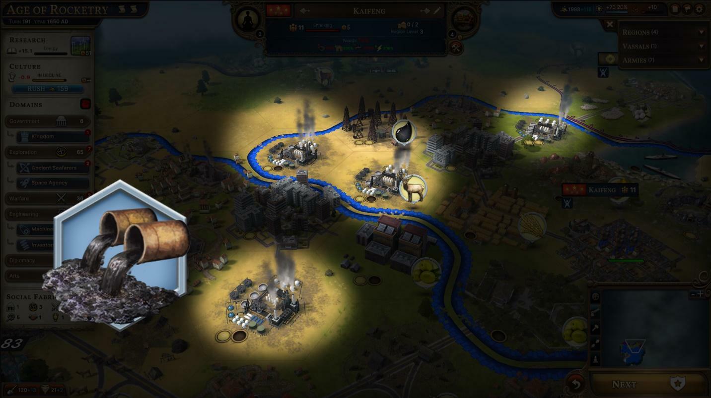 Alongside our main pillars in Atomic Ambitions, there are numerous other updates. We have updated various Improvements to produce Pollution. With the addition of Uranium to the game we felt Radioactive Waste was a natural addition. This byproduct of Uranium provides negative value to your Region, and is referred to by economists a “Bad” (which feels silly, but has the same logic to why we call things “Goods” in the first place). Once we decided we were going to add Radioactive Waste, I pitched the idea of retroactively adding other Bads to our fossil fuel Improvements, and that conversation grew to the new Pollution update.