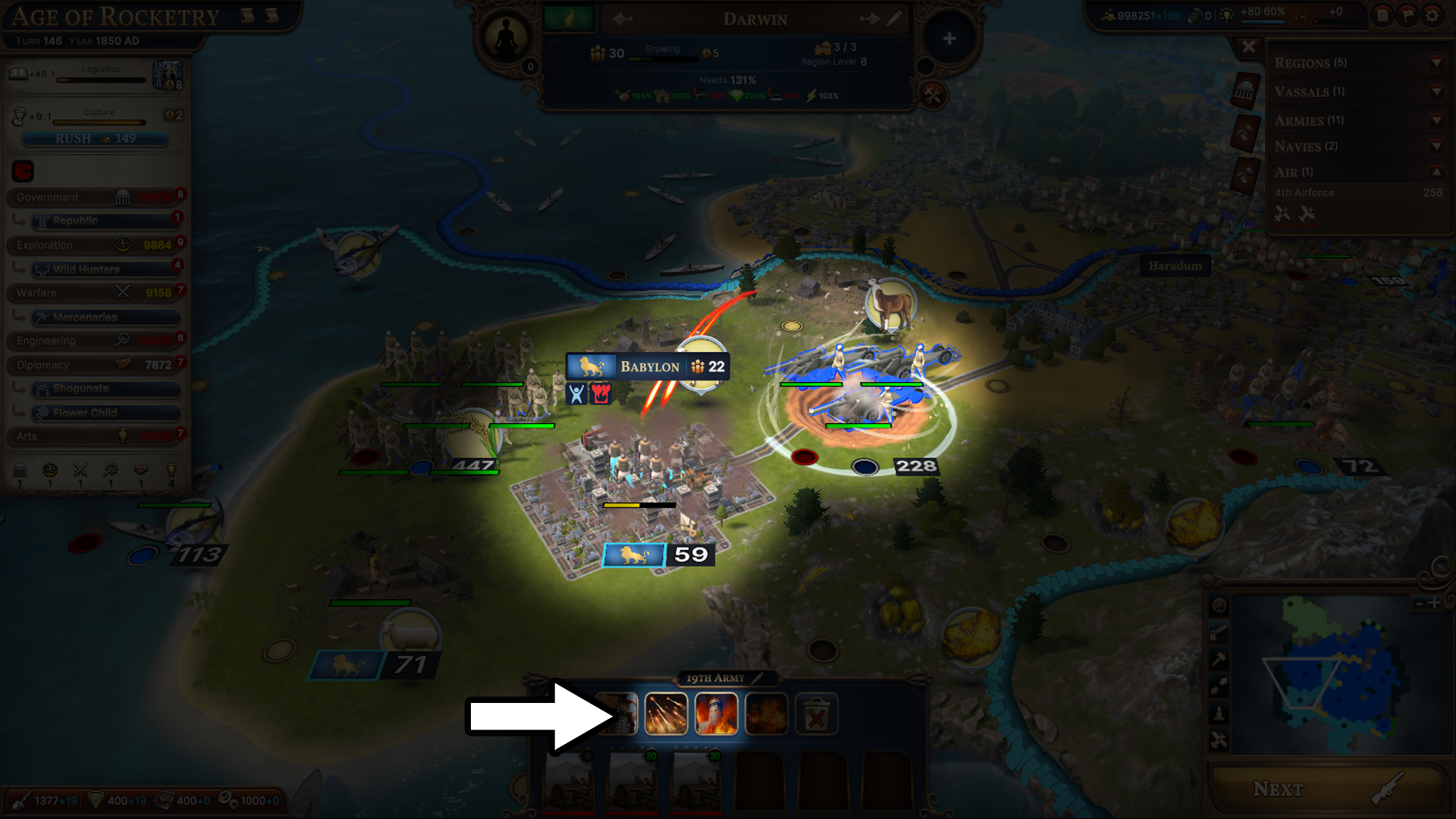 As you unlock and stockpile Nuclear Warheads you’ll inevitably end up in an Arms Race against other Nations and Factions in Age 8, and if the pressure builds too high then the timeline will be sent down the path of Age of Wasteland.