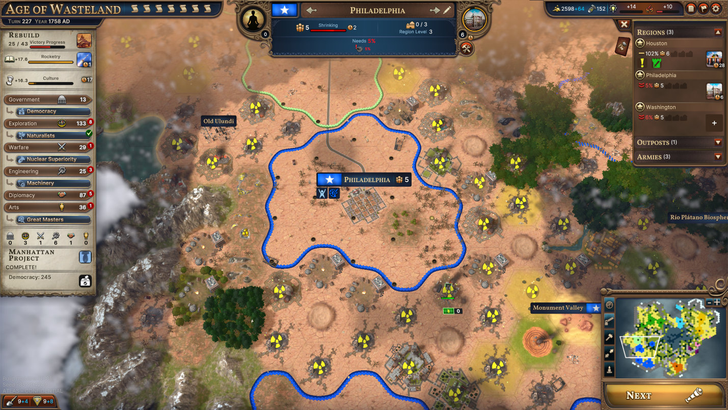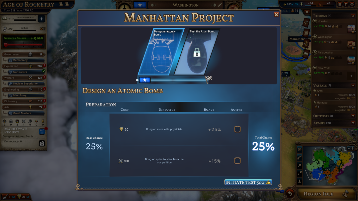 Age of Atom’s more warlike cousin is the second new Age introduced in [i]Atomic Ambitions[/i], the Age of Wasteland. This Age focuses primarily on one consequence of nuclear power: nuclear weapons. The upcoming free update brings the ability to unlock the Manhattan Project (a Megaproject, like the Space Race) in each of the Age 8 variants. With the Manhattan Project, you’ll research the secrets of the atom, discovering how to split the atom, then ultimately creating nuclear bombs.