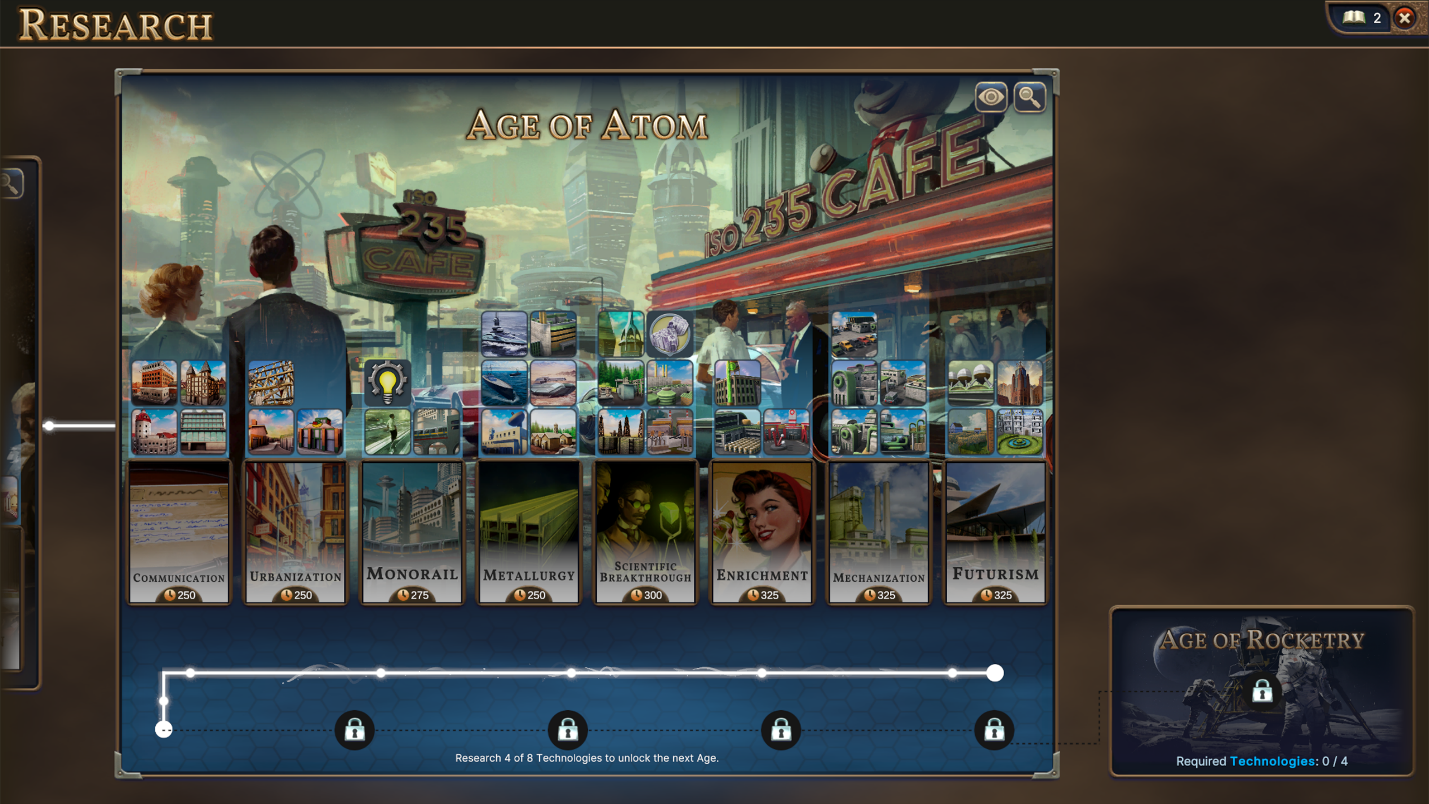 One of the two new Ages included in Atomic Ambitions, the Age of Atom, explores a more peaceful path. While nuclear power is available in the free update, this new Age provides unique ways to put it to use, at much earlier point in the game. Age of Atom’s final form is the result of a lot of competing concepts and iteration. The initial seed for the Age came from wanting to introduce Uranium before Age 8 (which is where we intend to unlock it for “normal” gameplay). We had a few interesting pitches for how we wanted to handle “early Uranium” (including an “Age of Nuclear Alchemy” where the mysterious properties of Uranium would be expanded in a mythological, superstitious direction). In the end, we found that an ahistoric retro-futuristic Age was perfect for the blend of mechanics and theme we wanted. The retro-futuristic look (or perhaps “futuristic” look if you take the viewpoint of the citizens living within the game), is not just skin-deep. We designed the content of the Age to reflect the emotion of the era we’re inspired by. A sort of fantastical time with near sci-fi technology, creative uses for Uranium with little downside, and a positive view toward future driven by atomic energy. Uranium is still a great a power source in the Age of Atom, but it can also be converted into a variety of new Goods, including Ferrouranium (the substitute for Steel in this Age), Luminous Paints, or Delicacies.