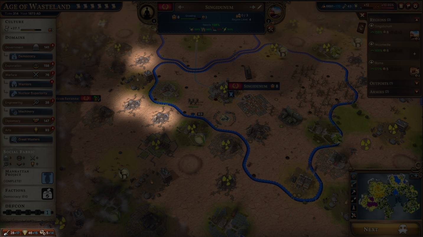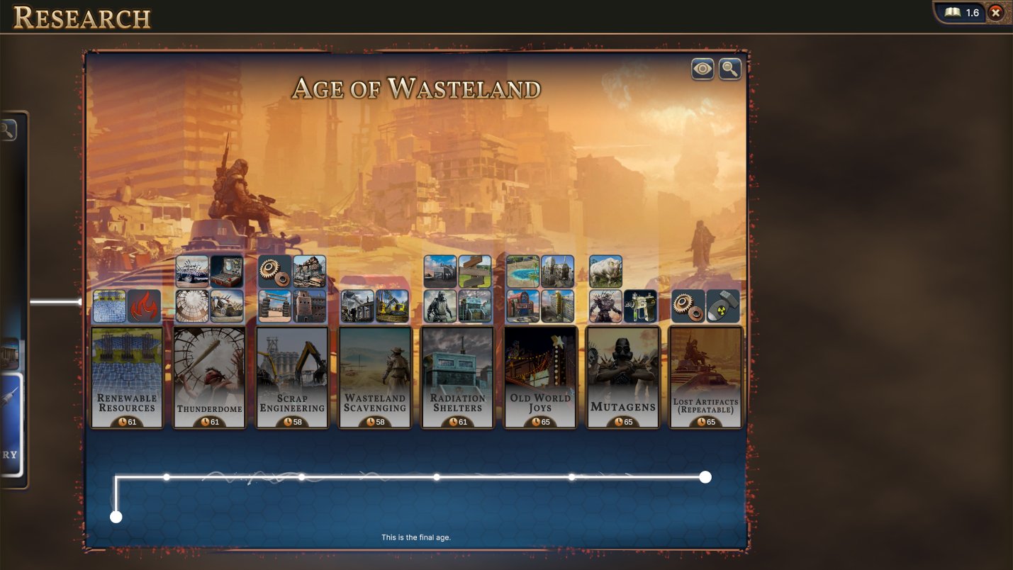 A key resource in this Age is Scrap, gathered from Scrap Heaps and the Junk Yard Improvement. All of the new Improvements unlocked in the Age of Wasteland require Scrap to build, and are much easier to work than the Improvements of old, based on the fact that the Grasslands, Forests, and Goods Tiles around the map have been turned into Wastelands and Dead Forests by nuclear blasts.